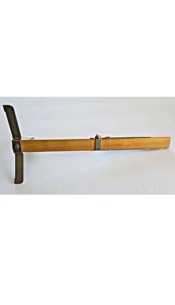 Era: 1950s Material: Wood with metal stand and clip Features: Adjustable ruler, measures up to 20 inches; includes clip for marking fabric and three metal prongs for stability Condition: Great vintage condition; minor signs of wear consistent with age (refer to photos for details)