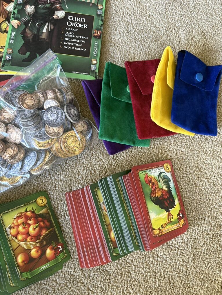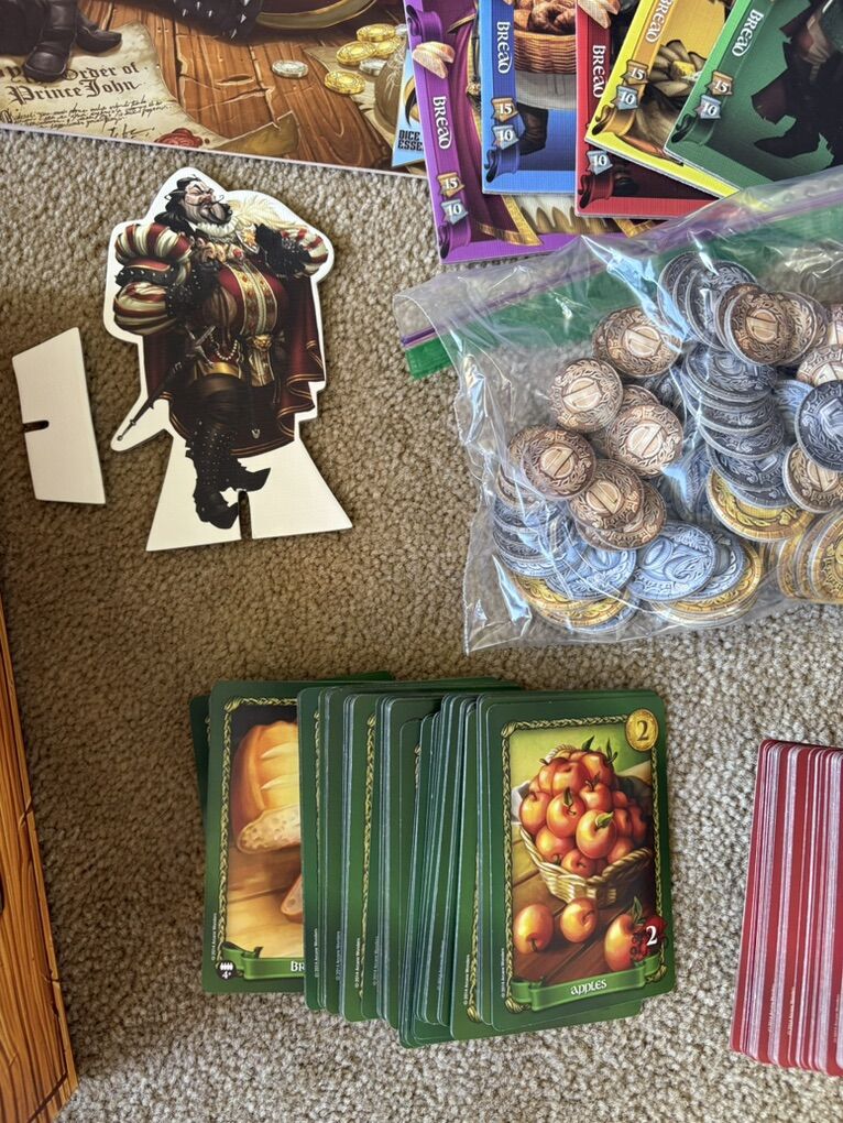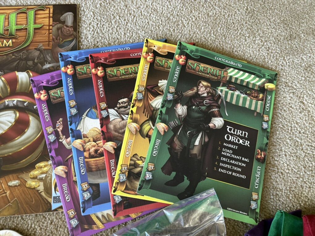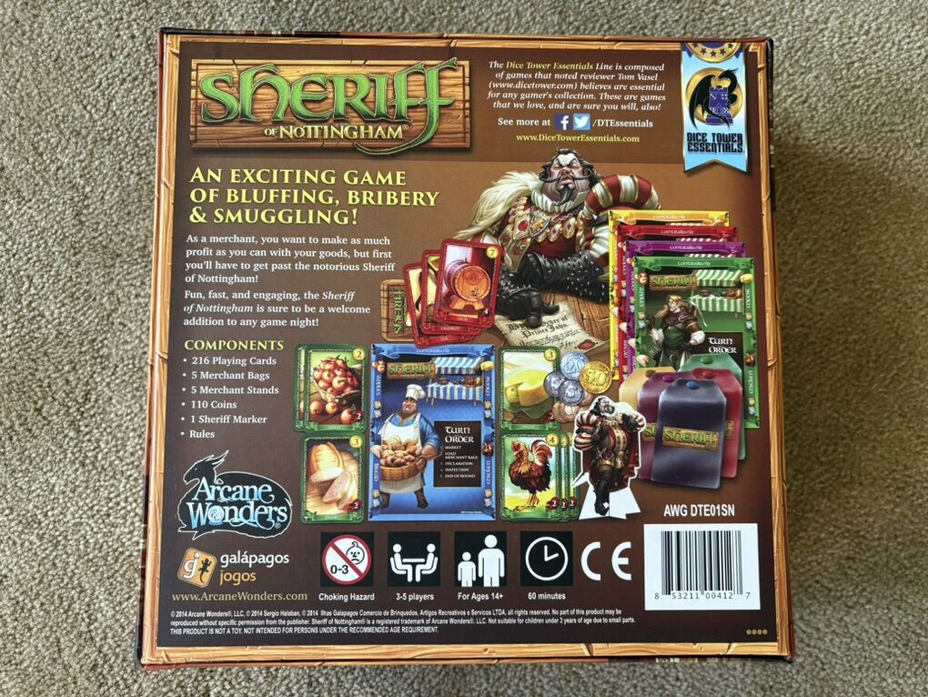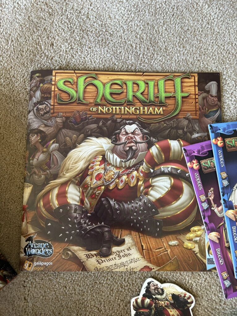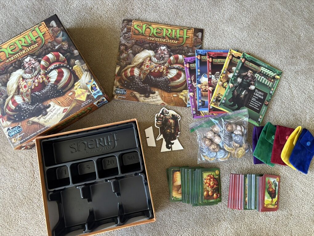 COMPLETE Sheriff of Nottingham Game (1st Edition): An exciting game of bluffing, bribery & smuggling! Ages 14+, 3-5 players. Award-winning game by Sergio Halaban, Bryan Pope, & Andre Zatz, Arcane Wonders, Galapagos, 2014. High-quality game. Complete, no missing pieces. Very good condition (a couple of cards slightly bent). Text only. Cash or Venmo.