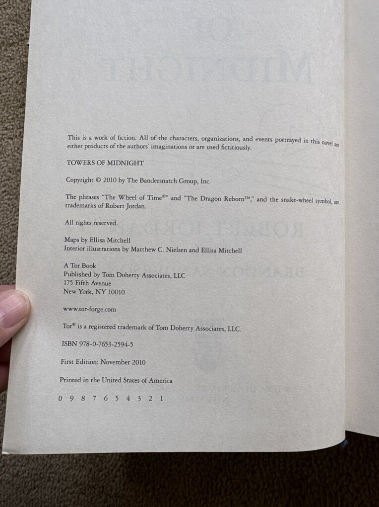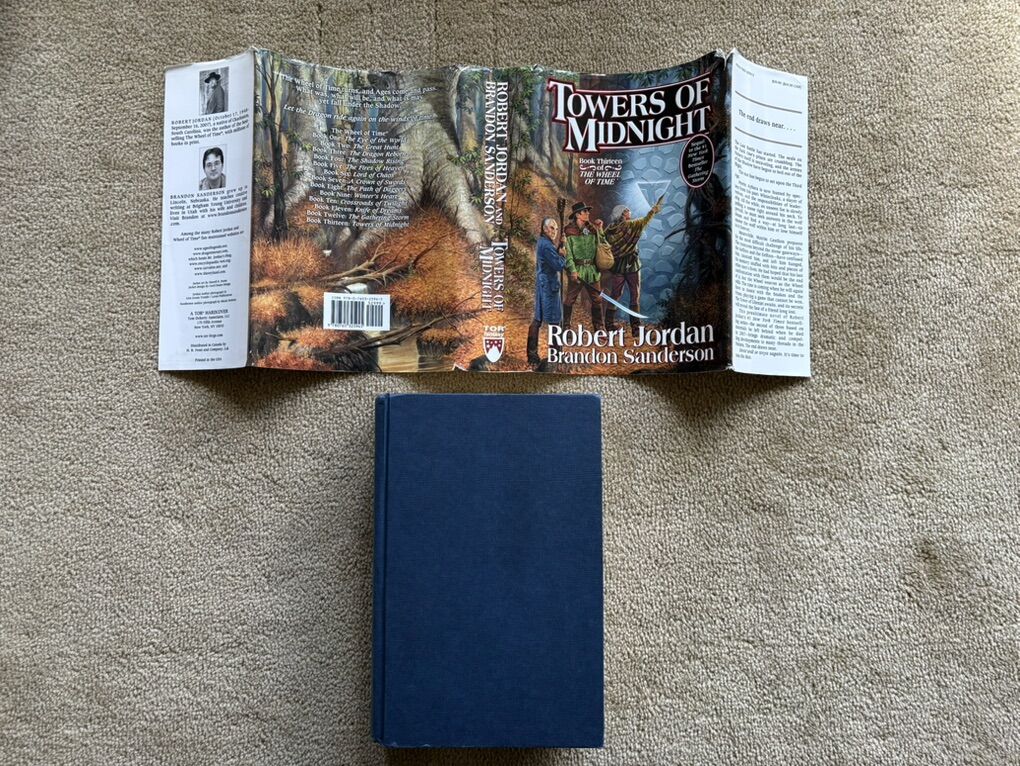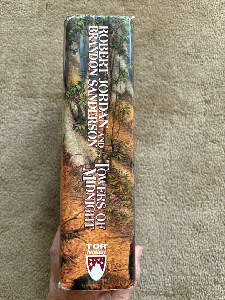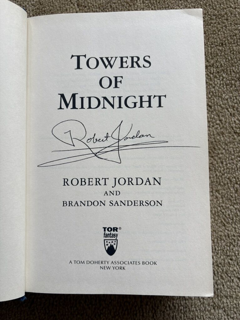 Towers of Midnight, by Robert Jordan and Brandon Sanderson. Book 13 in The Wheel of Time series, finished by Sanderson after Jordan died. SIGNED by Robert Jordan on title page (electronic posthumous signature). First edition hardcover (larger 9.5” version) in very good condition, including dust jacket (some wear/tears on corners--see photos). Tor Fantasy, 2010, 861 pages. Text only. Cash or Venmo.