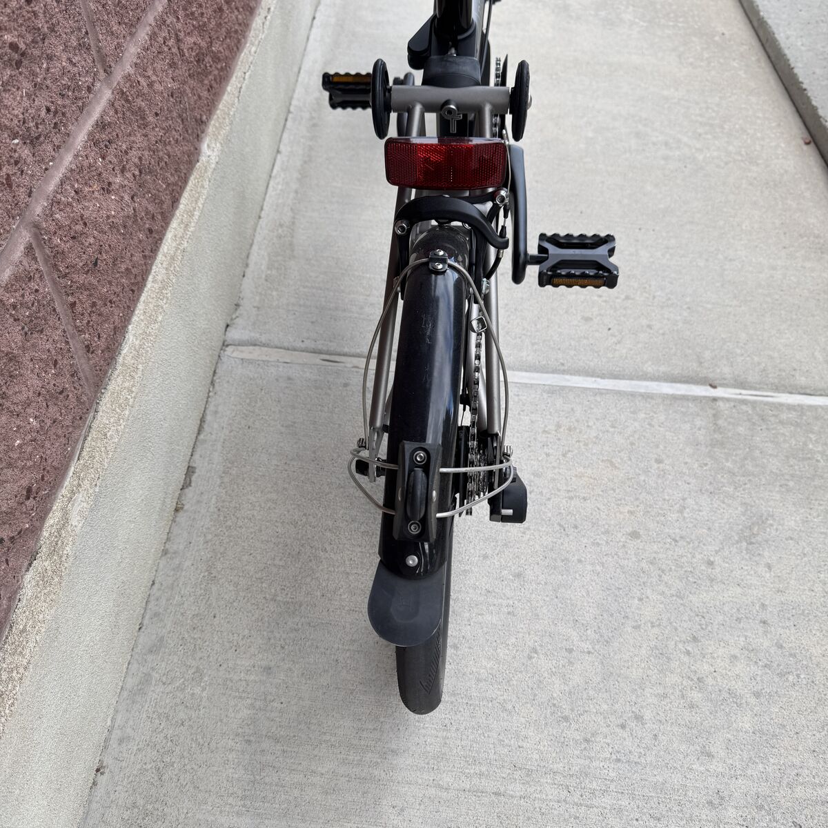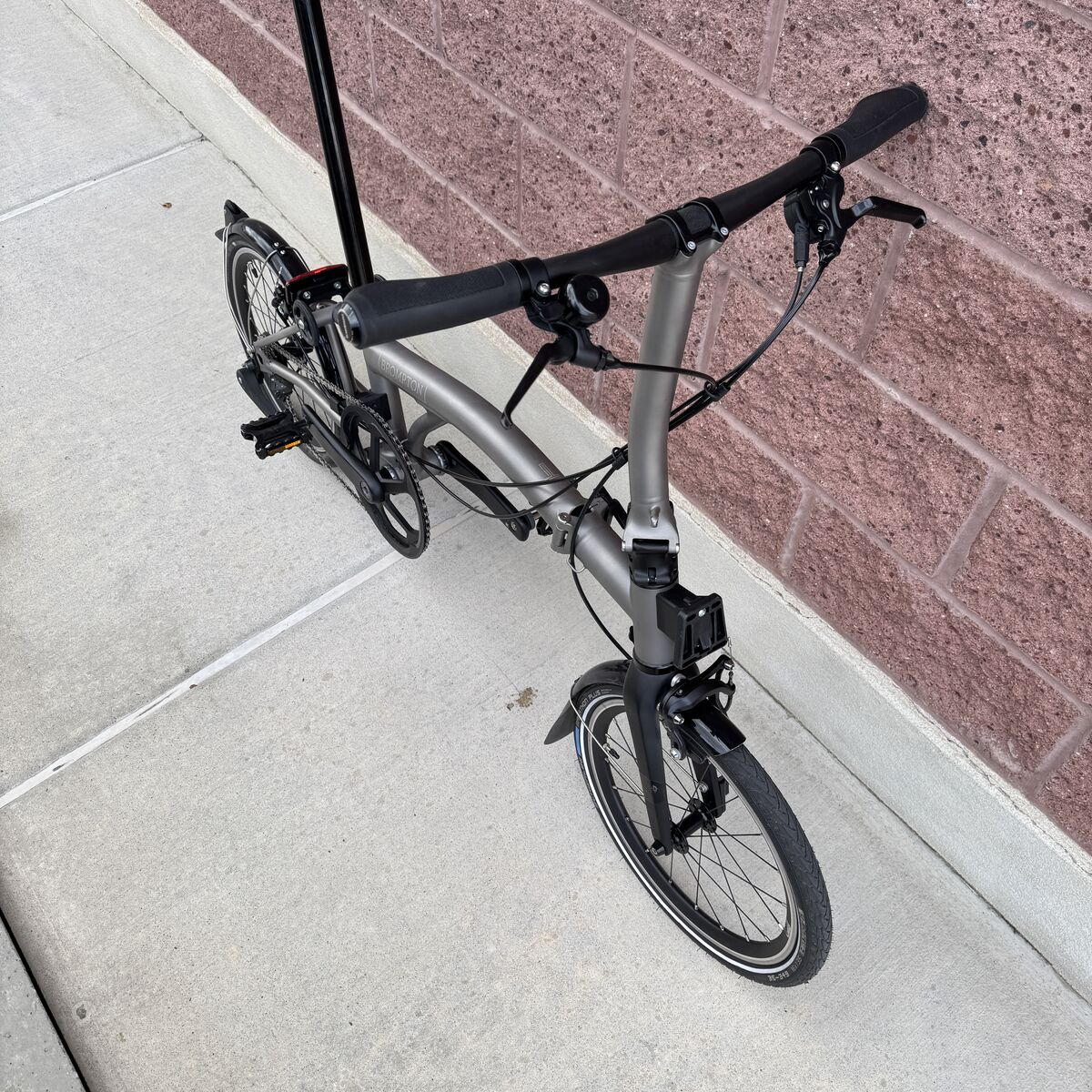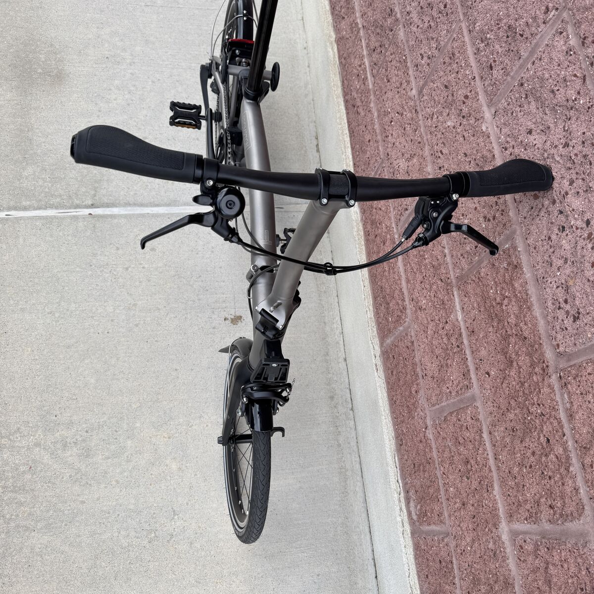 This Brompton T Line 4-Speed is in excellent condition. The frameset is Titanium, and the fork, handlebar and saddle are carbon, so its very light weight at about 18 pounds. This is the version with the low handlebar. It folds all together to make it very compact and portable. It has less than 300 miles on it.
