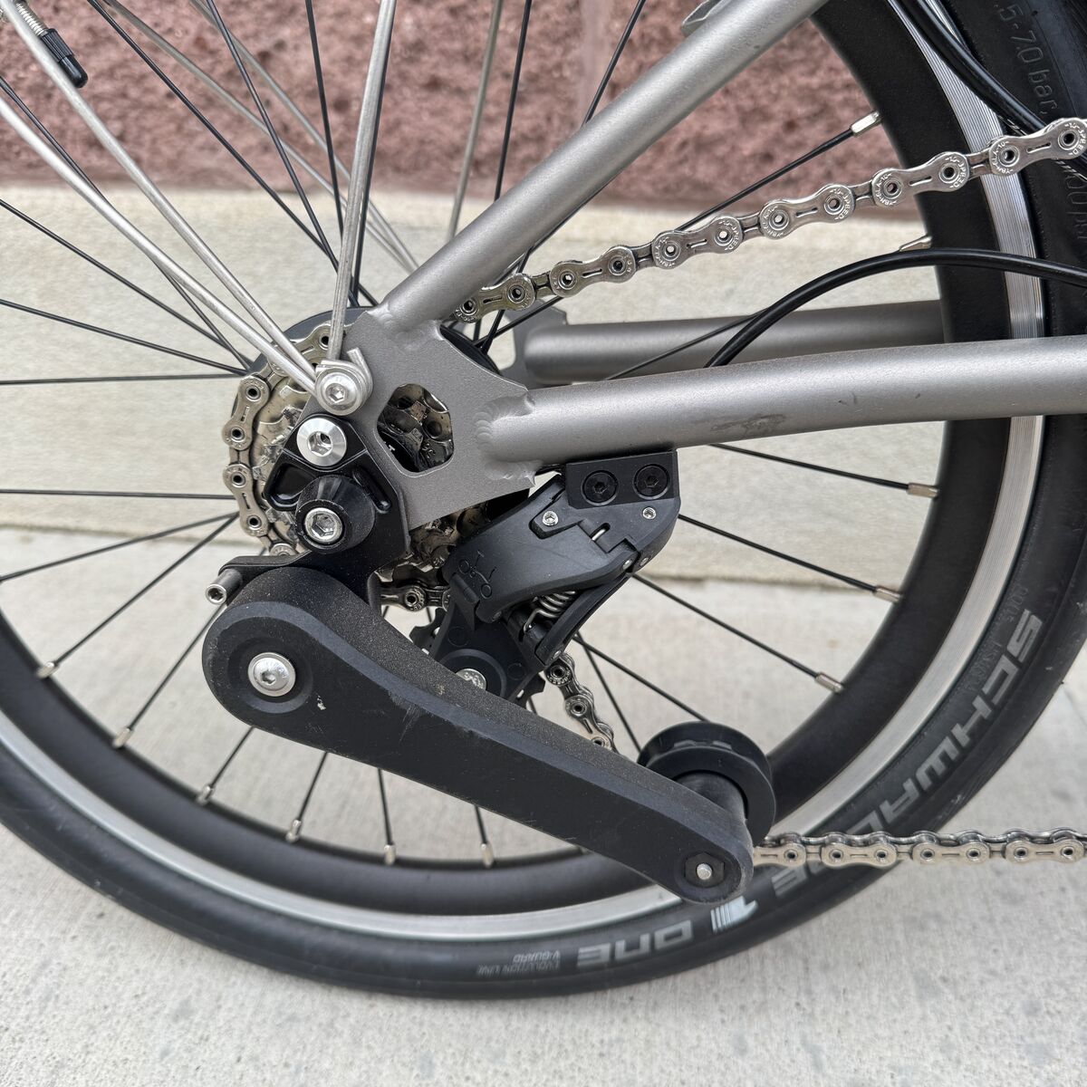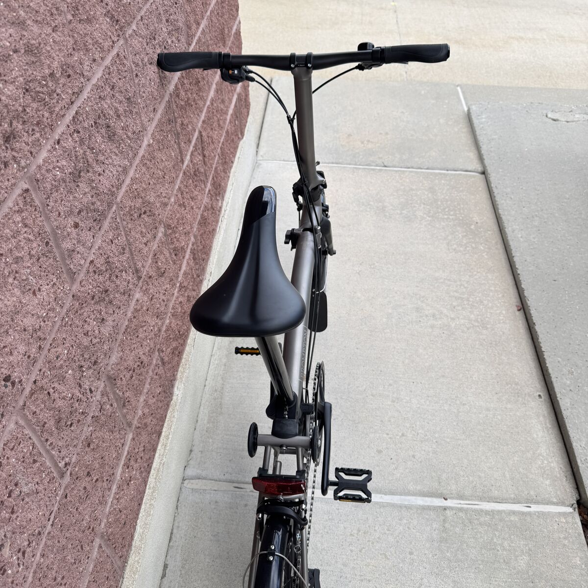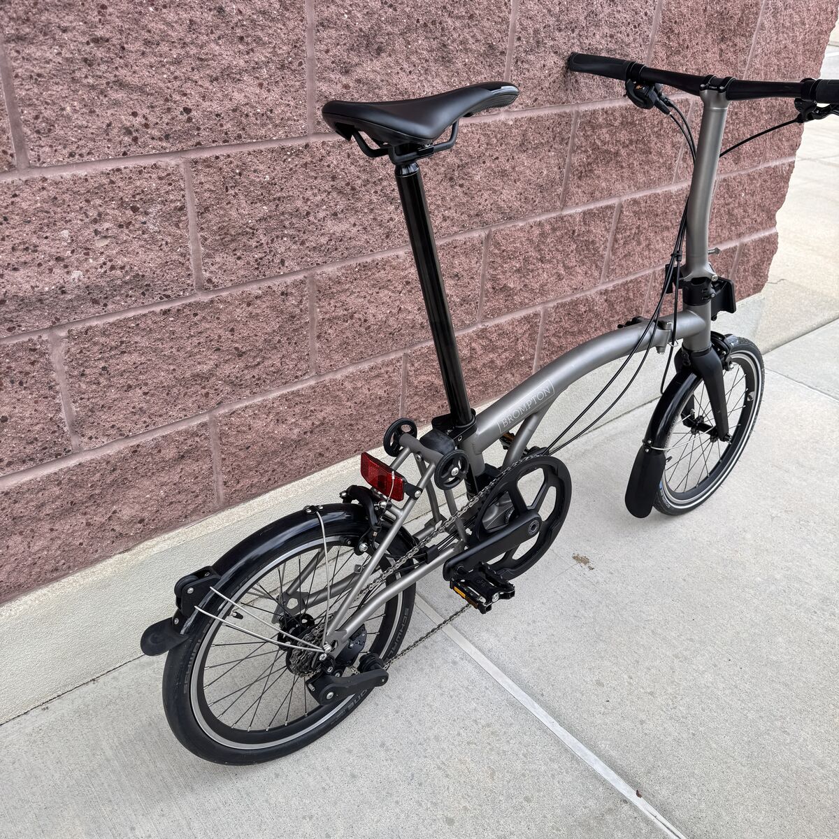 This Brompton T Line 4-Speed is in excellent condition. The frameset is Titanium, and the fork, handlebar and saddle are carbon, so its very light weight at about 18 pounds. This is the version with the low handlebar. It folds all together to make it very compact and portable. It has less than 300 miles on it.