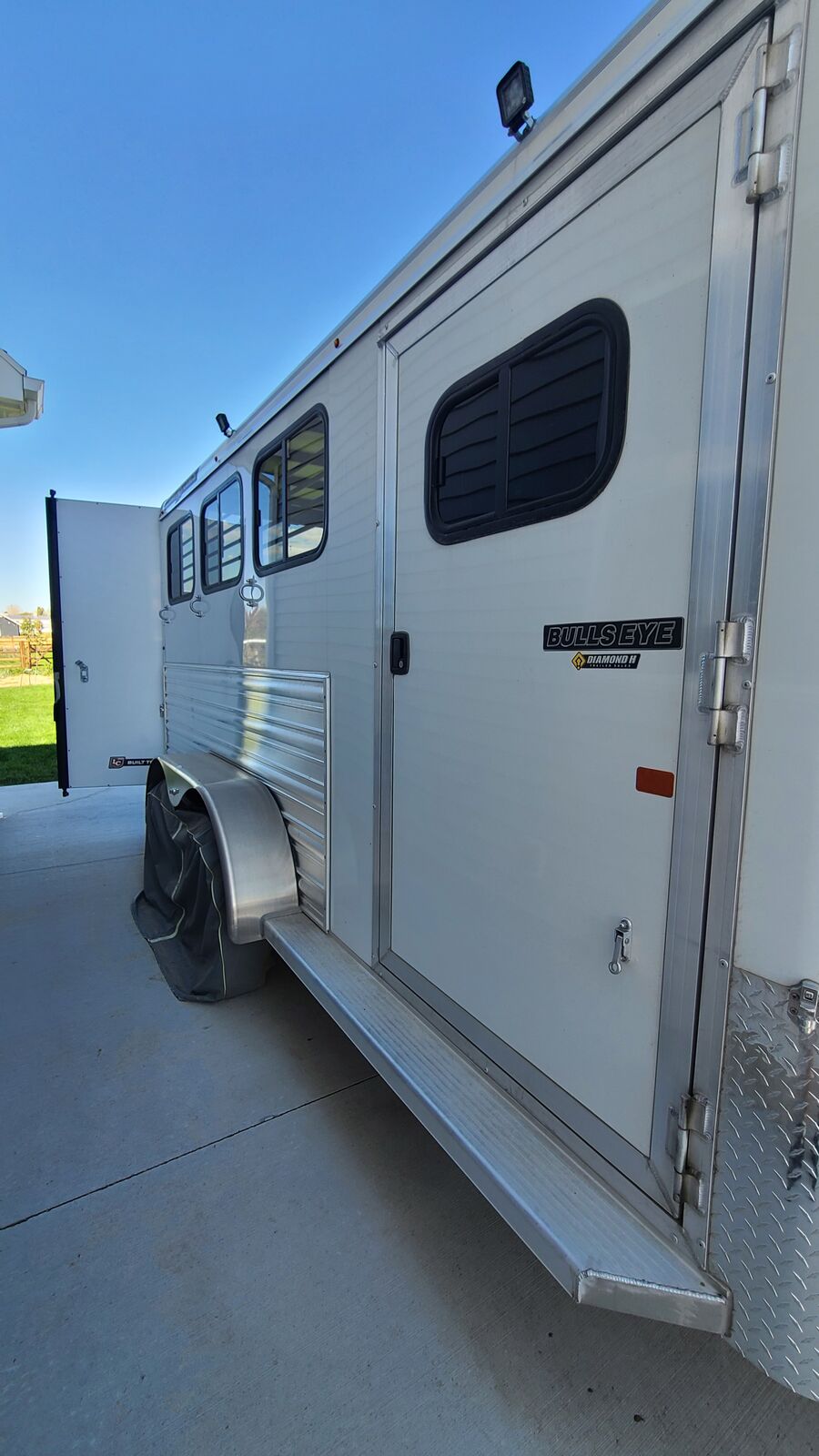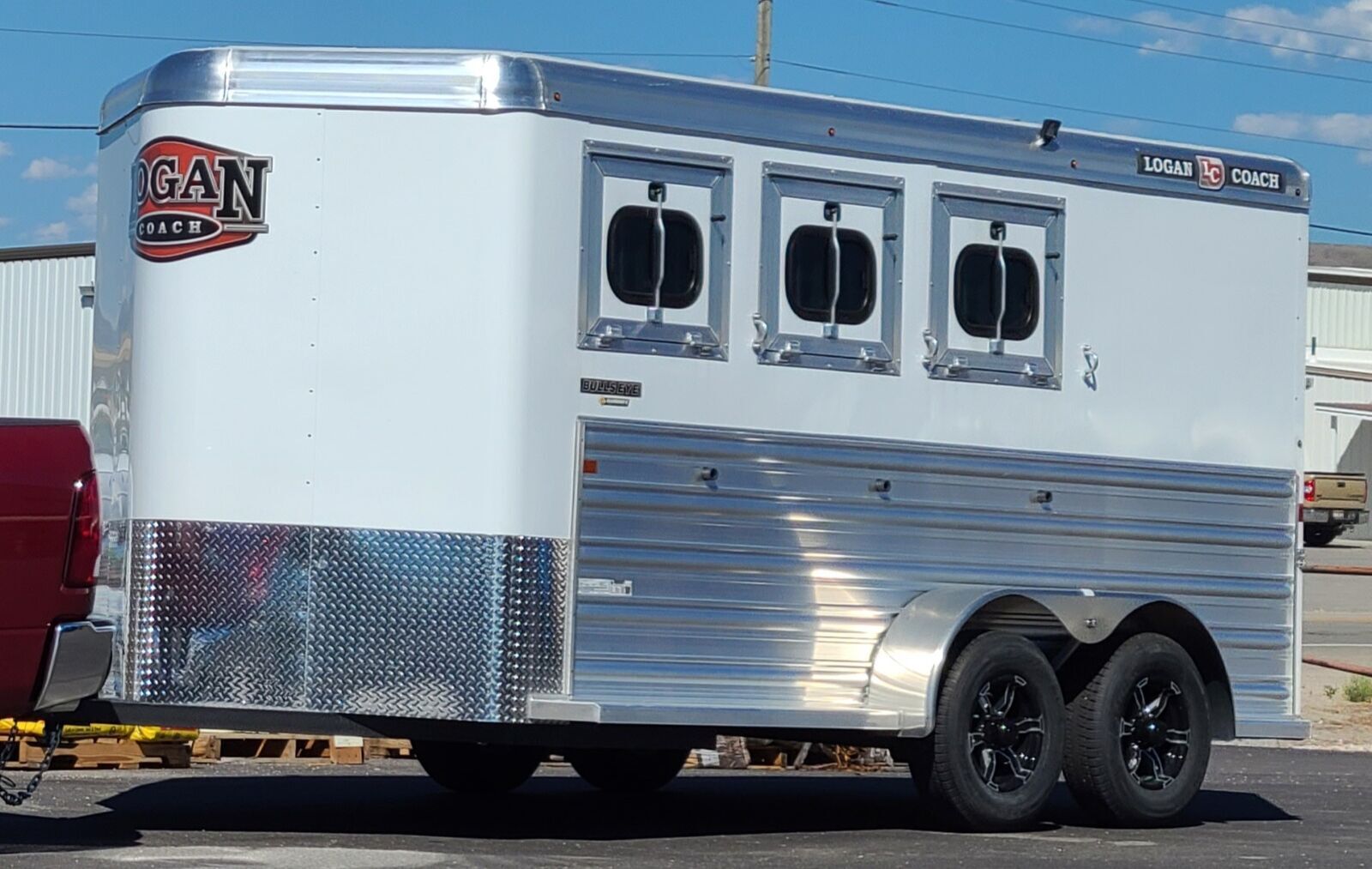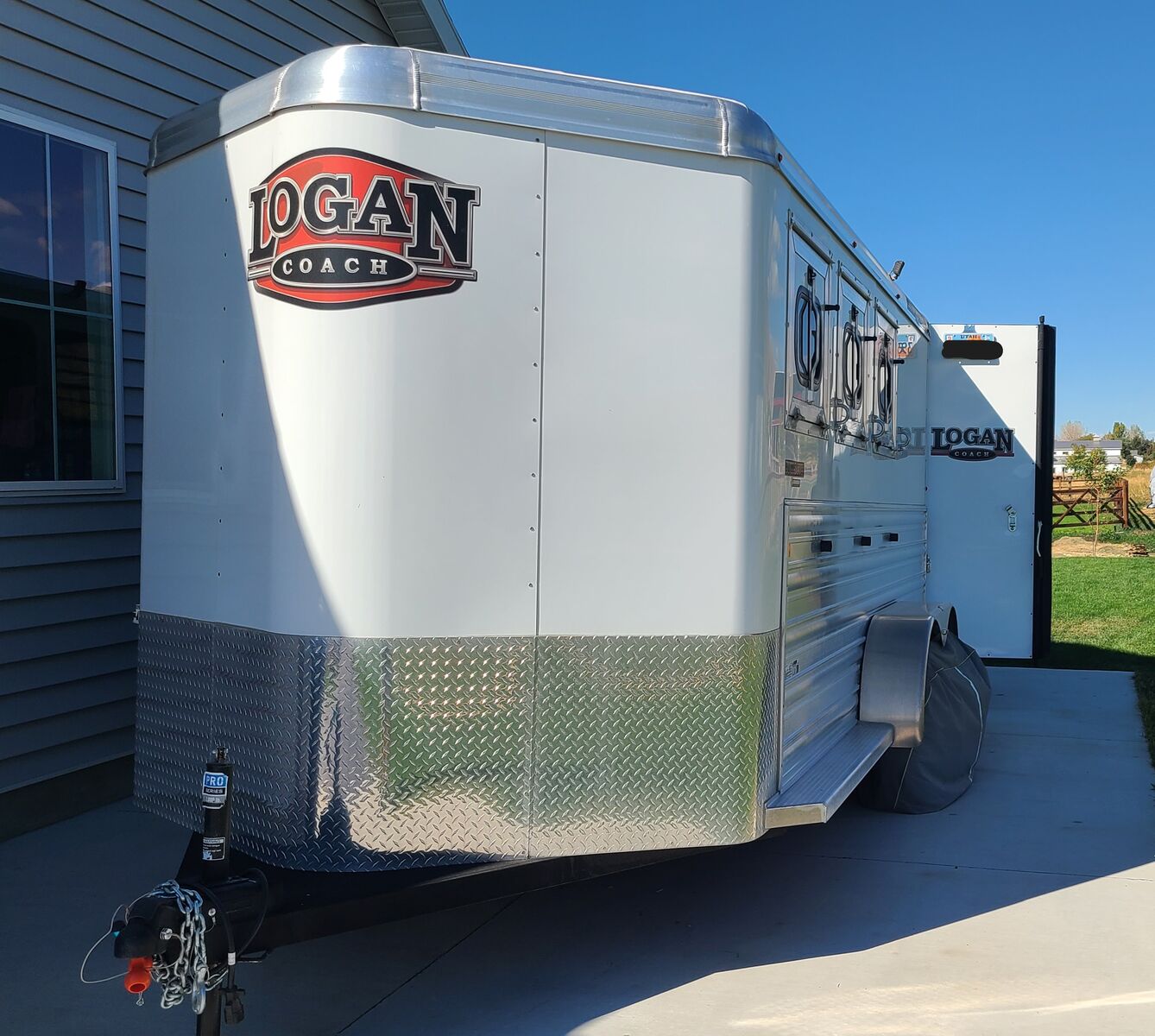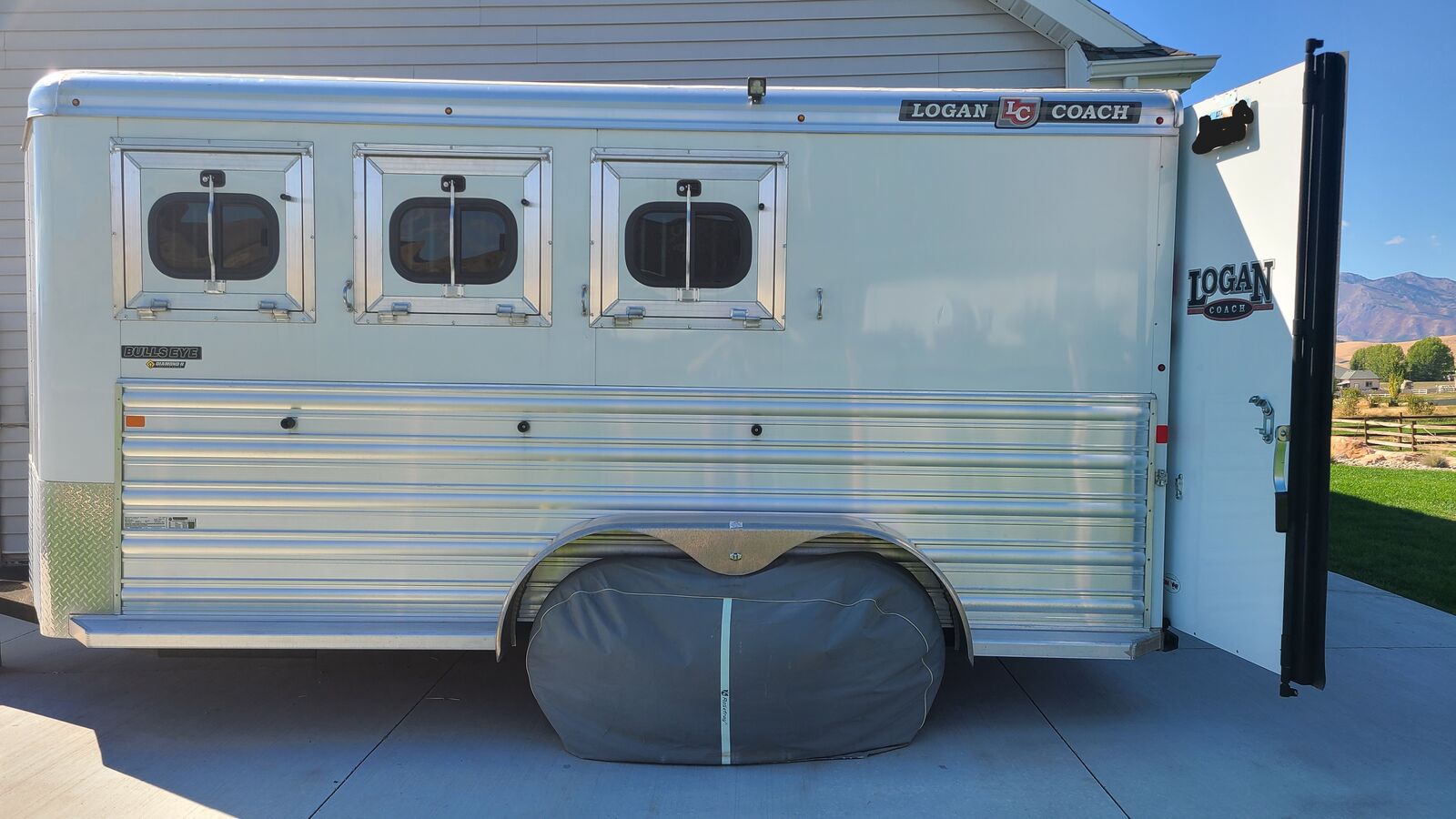 2023 Logan Coach Bullseye 3 horse slant load bumper pull trailer. Exellent condition. Original owner. Put less than 500 miles on it in 2 years we owned it. 3.5K axles with 8 ply tires. 7' tallx6'9" wide. 3 HD drop down windows with lowerable jail bars and screens. 3 sliding windows with screens. HD tack room door. 35 gallon corner water tank in tack room. 3 place swing out adjustable saddle rack. 4 blanket bars and 12 bridle hooks in carpeted tack room. Spare tire. Pop up roof vents. 2 HD adjustable/telescoping padded stall dividers. Wood floor with rubber mat. Vortex rubber coating on inside stall area. Steel frame with aluminum exterior. LED lights in stall area, tack room and around exterior. Tows very well. Wheel/tire covers included.