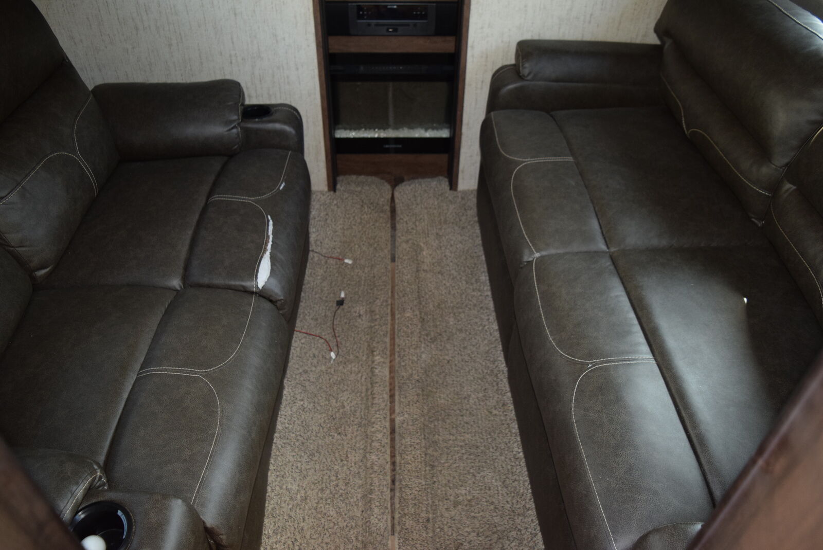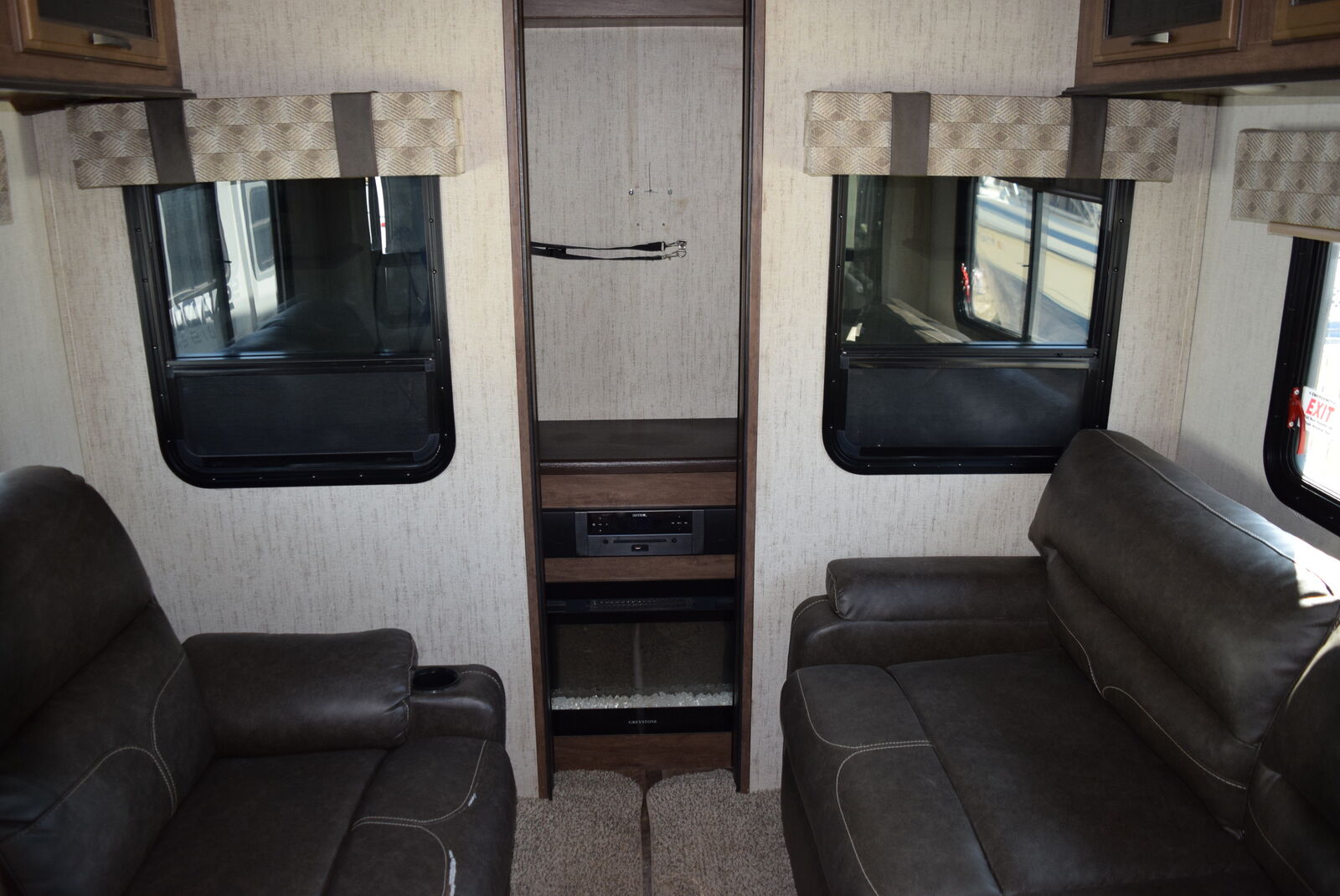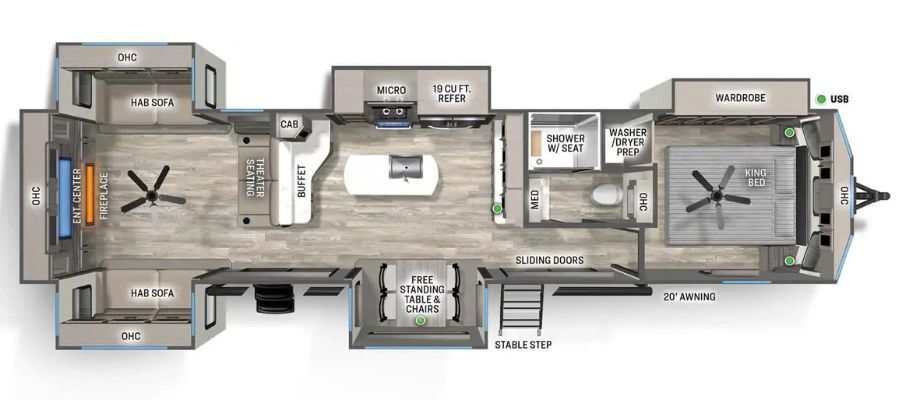 The rear den floorplan is one of Sandpiper’s most popular layouts for good reason — it feels like a true home! The spacious rear living room features opposing slides for a wide-open feel, dual tri-fold sofas (both convert to beds), theater seating, a large entertainment center, and a fireplace for cozy evenings.