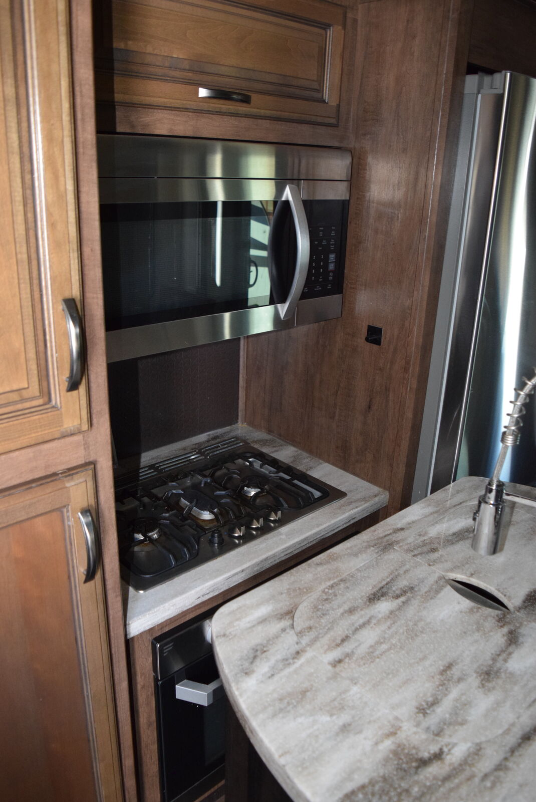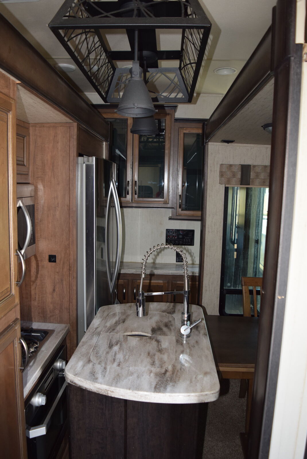 The center kitchen is a chef’s dream — solid surface countertops, residential stainless steel appliances, a 4-door refrigerator, freestanding dinette, and tons of pantry and cabinet space. Whether you’re entertaining guests or settling in for extended stays, you’ll love how functional and beautiful this space is.