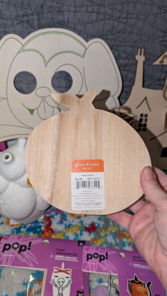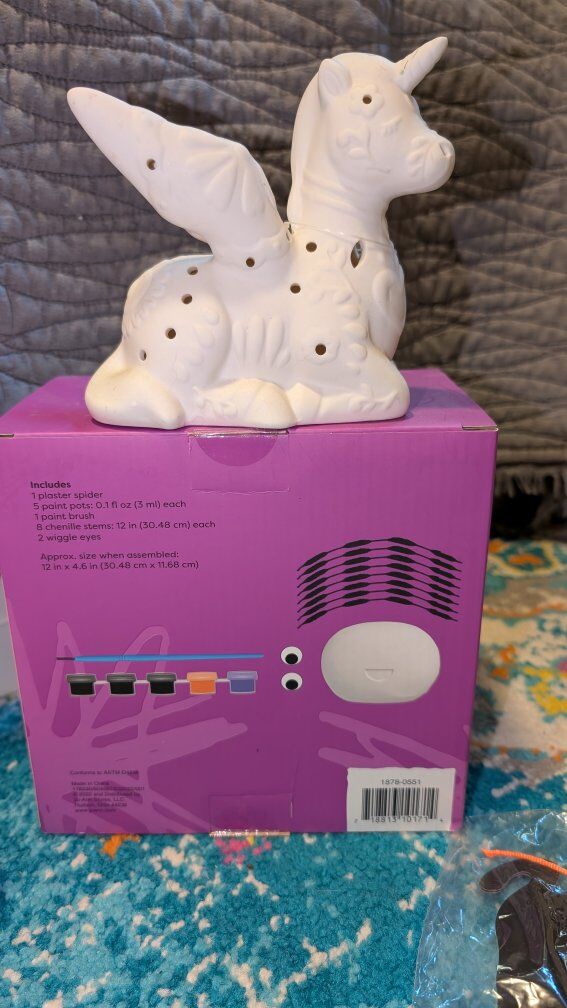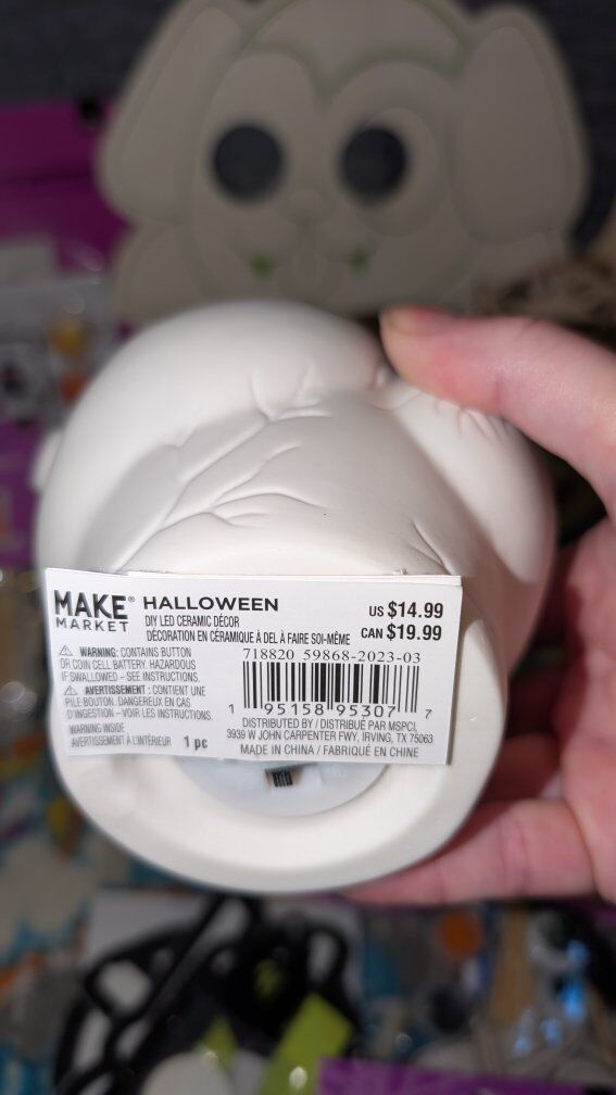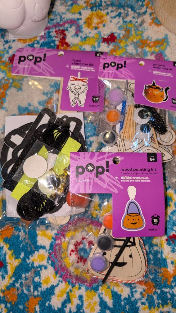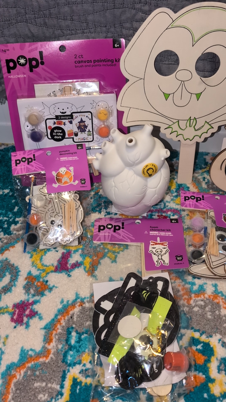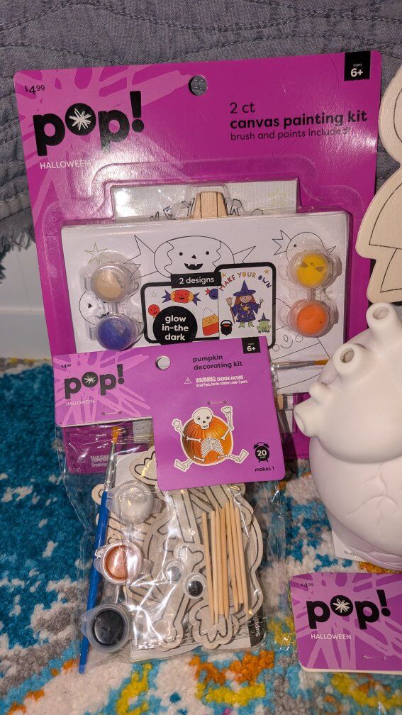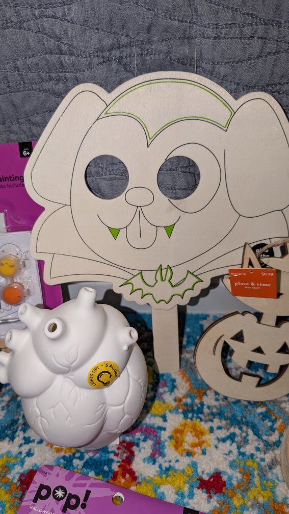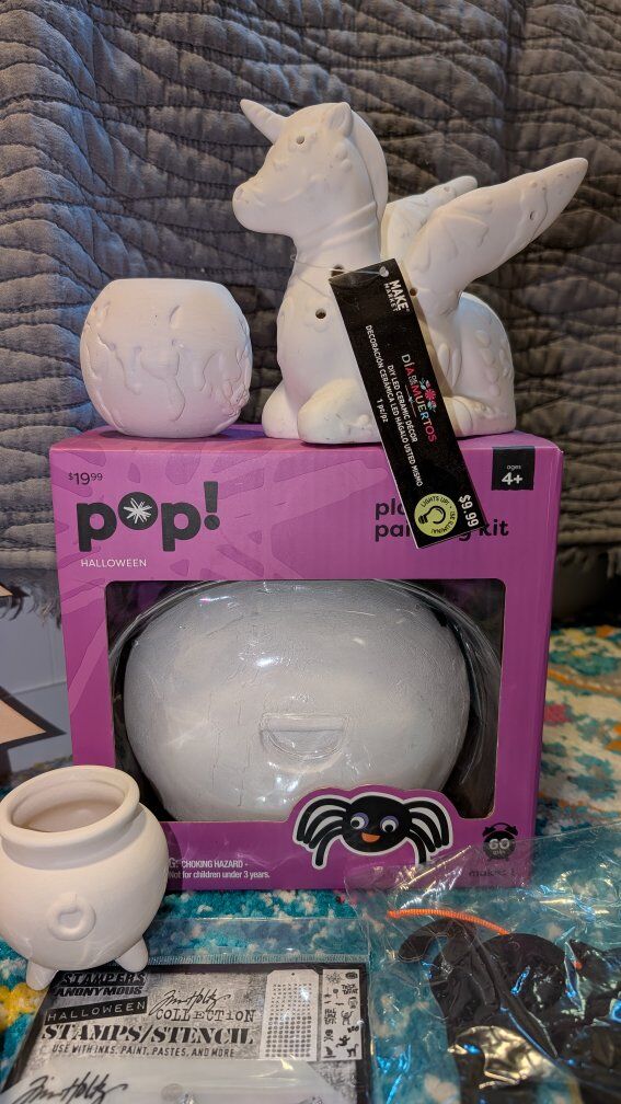 Includes: *Ceramic spider painting kit (was $19.99) *Ceramic cauldron planter *Ceramic earth planter *Ceramic Day of the Dead unicorn that lights up. (Was $9.99) *Ceramic anatomical heart that lights up (was $14.99) *Halloween stamp kit *Wooden jack-o'-lantern (was $9.99) *Wooden haunted house hanger (was $9.99) *Wooden cat and jack-o'-lantern hanger (was $6.99) *Wooden vampire mask with glow in the dark lines (was $2.99) *Halloween canvas paint kit (was $4.99) *Skeleton pumpkin decorating kit (was $4.99) *Skeleton foam puppet kit (was $4.99) *Witch cat decorating kit (was $4.99) *Pumpkin wooden hanging kit (was $2.99) *Black cat hanging decoration