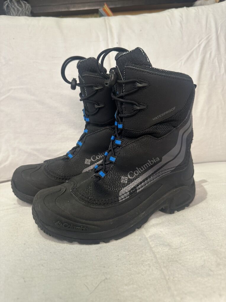 Columbia youth size 6 waterproof winter boots. These are black, leather and rubber with blue trim, and have 400 g of insulation with elastic laces and a toggle at the top. They are in excellent condition, see photos for details. I take cash or Venmo, but cash is preferred. Text is best. 801-201-4446. Check out my other ads for additional sizes and styles.