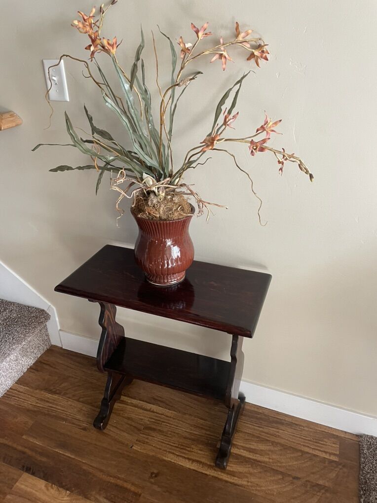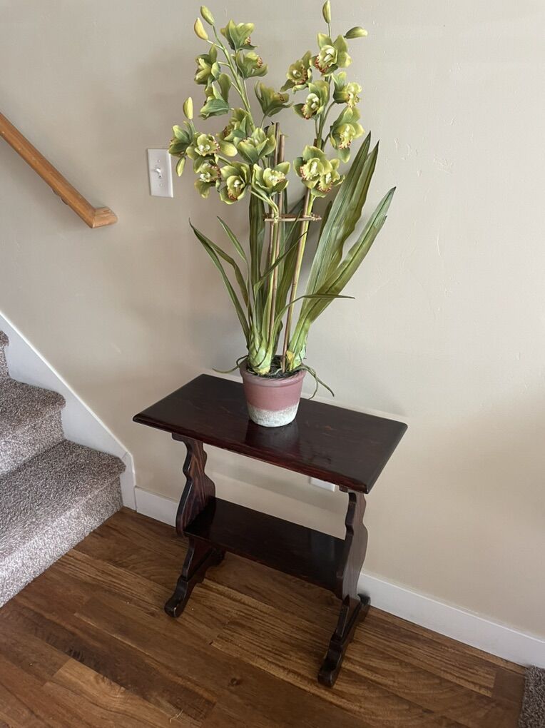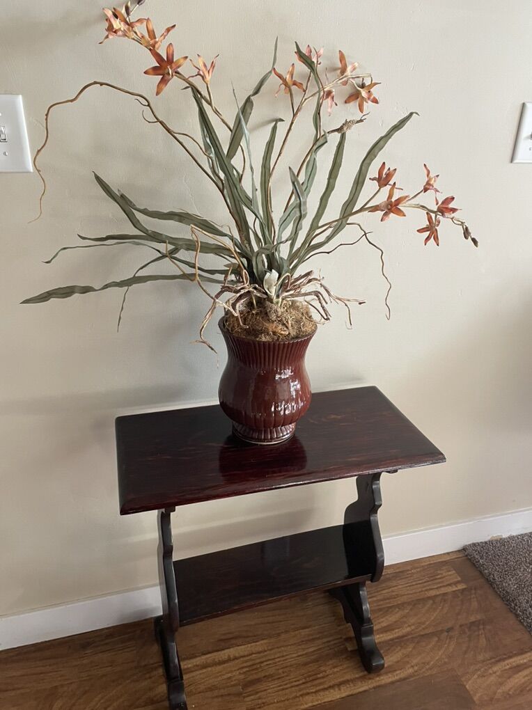 I have two professionally arranged flower arrangements with pots. The colors are perfect for fall! The orchid is 35” tall in a 7” pot & the orange flowers are 27” tall in a 8” pot.