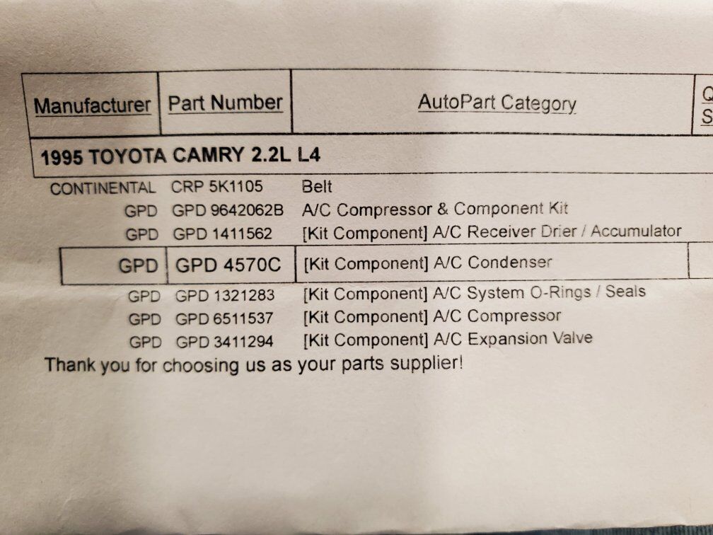VenmoPurchased for my dad, but he never used any of it. All parts are still in the original packaging. All parts will fit Toyota Camry 1994 to 1996, but most of the parts will also fit a wider range of years, as well as other vehicles. Let me know if you want to cross reference, I can tell you an easy way to do it. GPD 9642062B AC compressor and Component kit, including condenser. This kit is $271 on RockAuto.com Kit includes: compressor, condenser, receiver drier/accumulator, expansion valve, o-rings/seals and a belt.