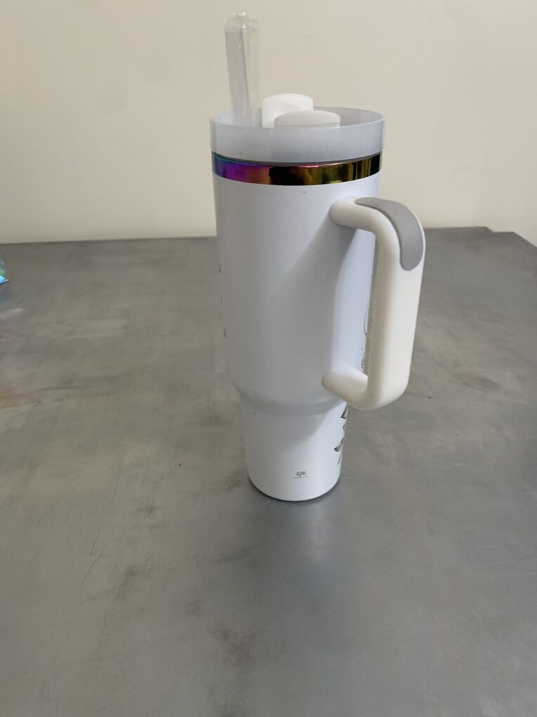 VenmoWhite engraved multi-color/oilslick Tumbler Large it has a butterfly and flowers/leaves on it as a design. I do not know the exact size maybe 32oz? Brand new never used, has a clear straw still in packaging.