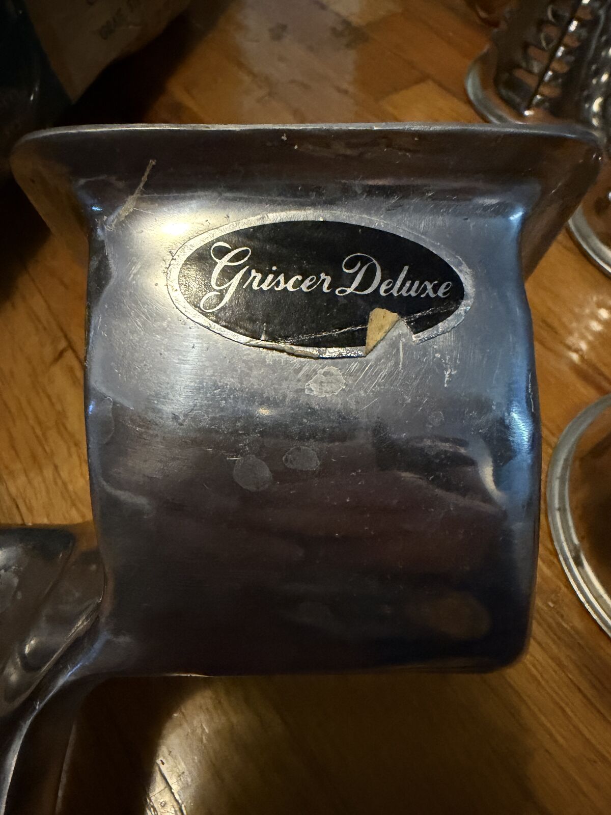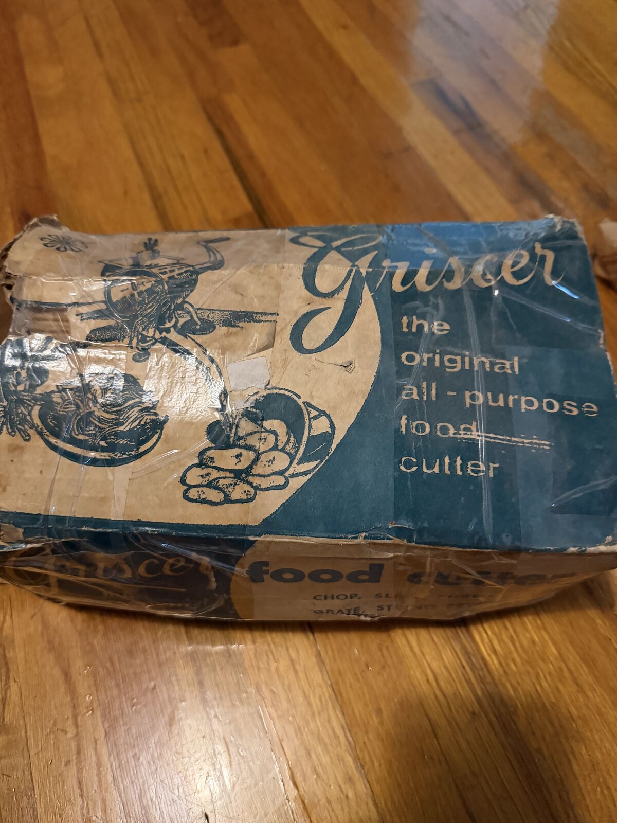 VenmoVintage Griscer Deluxe the original all purpose food chopper. This is a manual clamp on food chopper comes with 5 cutters that can grate, slice, shred, chop, or string fresh vegetables, fruit, or cheese.