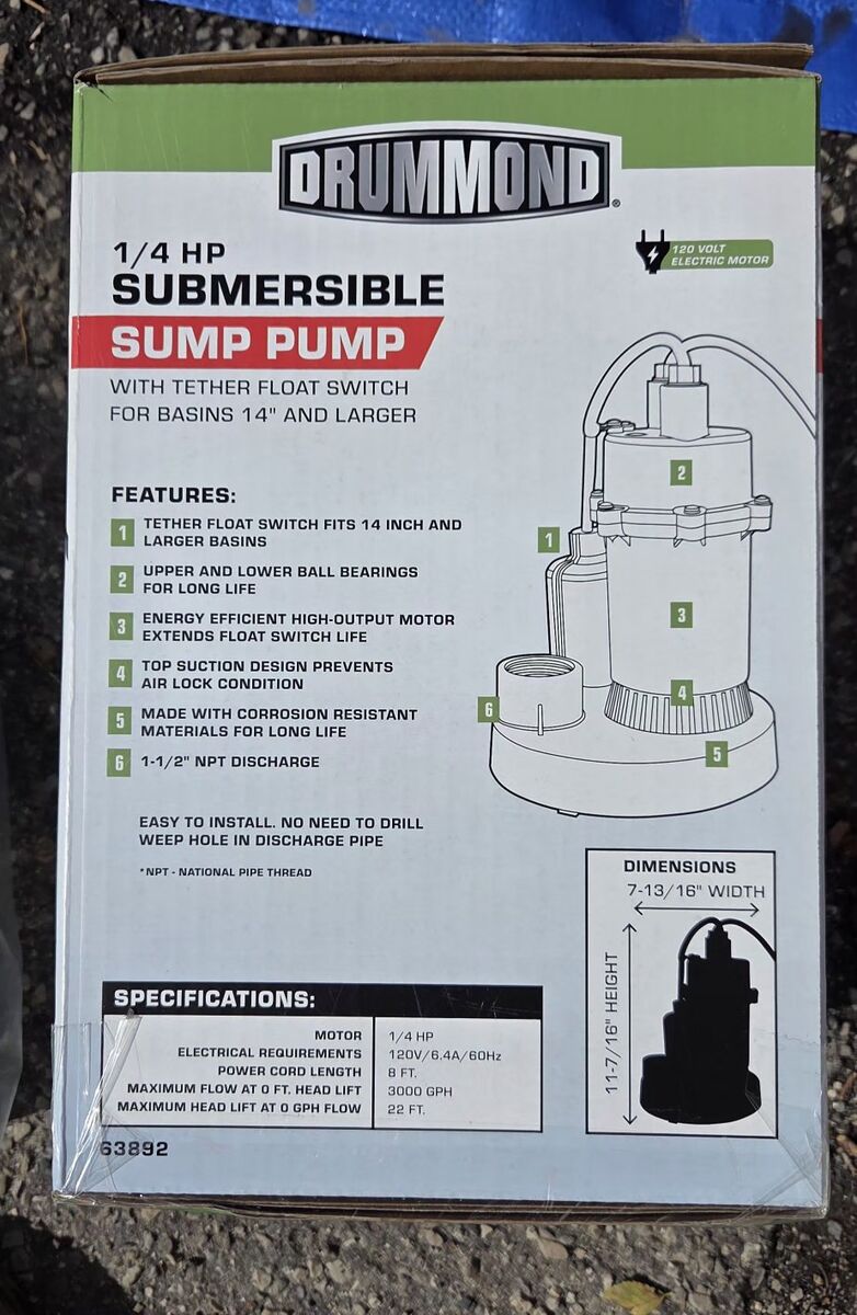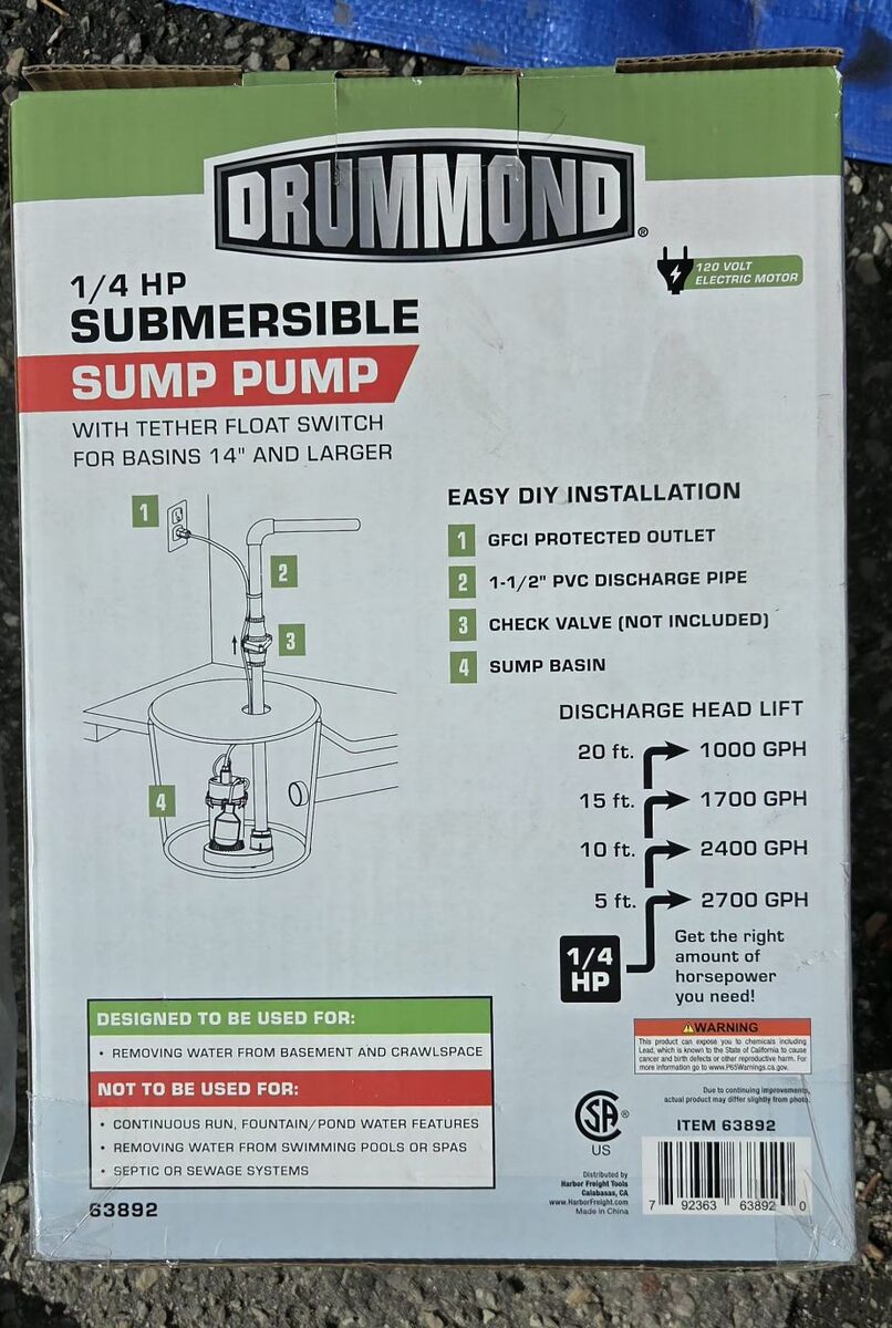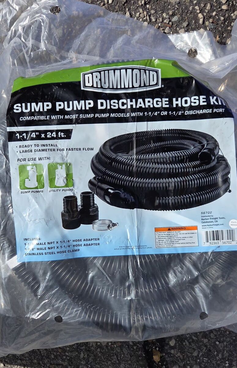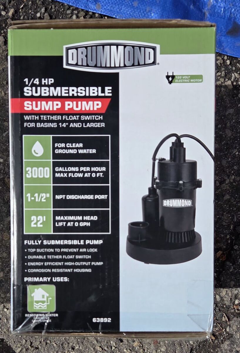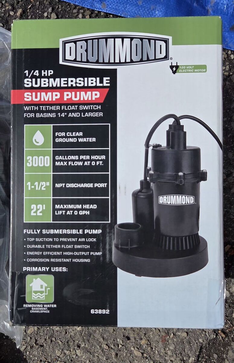 VenmoDRUMMOND 1/4 HP Submersible Sump Pump, 3000 GPH & DRUMMOND 1-1/4 in. x 24 ft. Sump Pump Discharge Hose Kit. Brand new, unopened, gift, but not what I needed. It is past the return date too so selling it here. Combo is worth $76 at Harbor Freight.