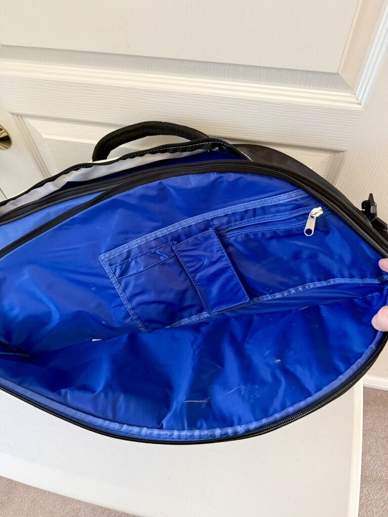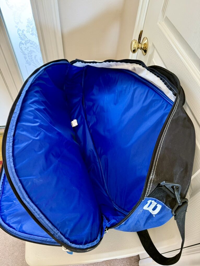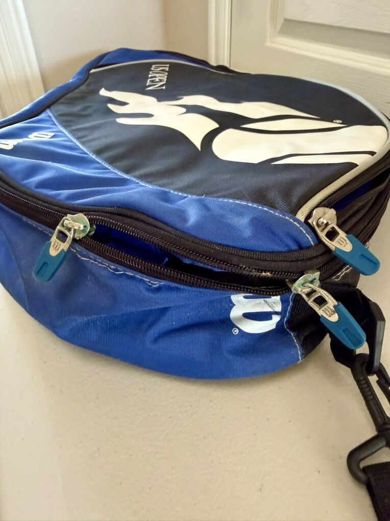 Like new condition other than the zipper on the racket compartment doesn’t close all the way. Please see pictures. It holds the rackets great. It has a shoulder strap. It’ll hold 2-3 rackets. $40.