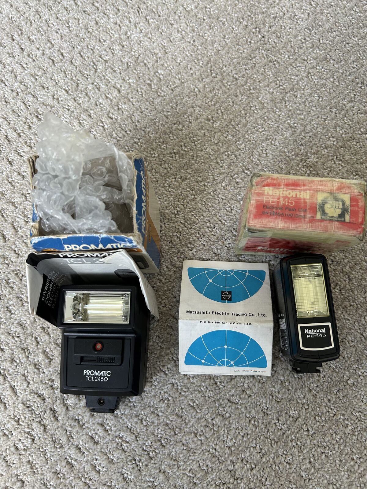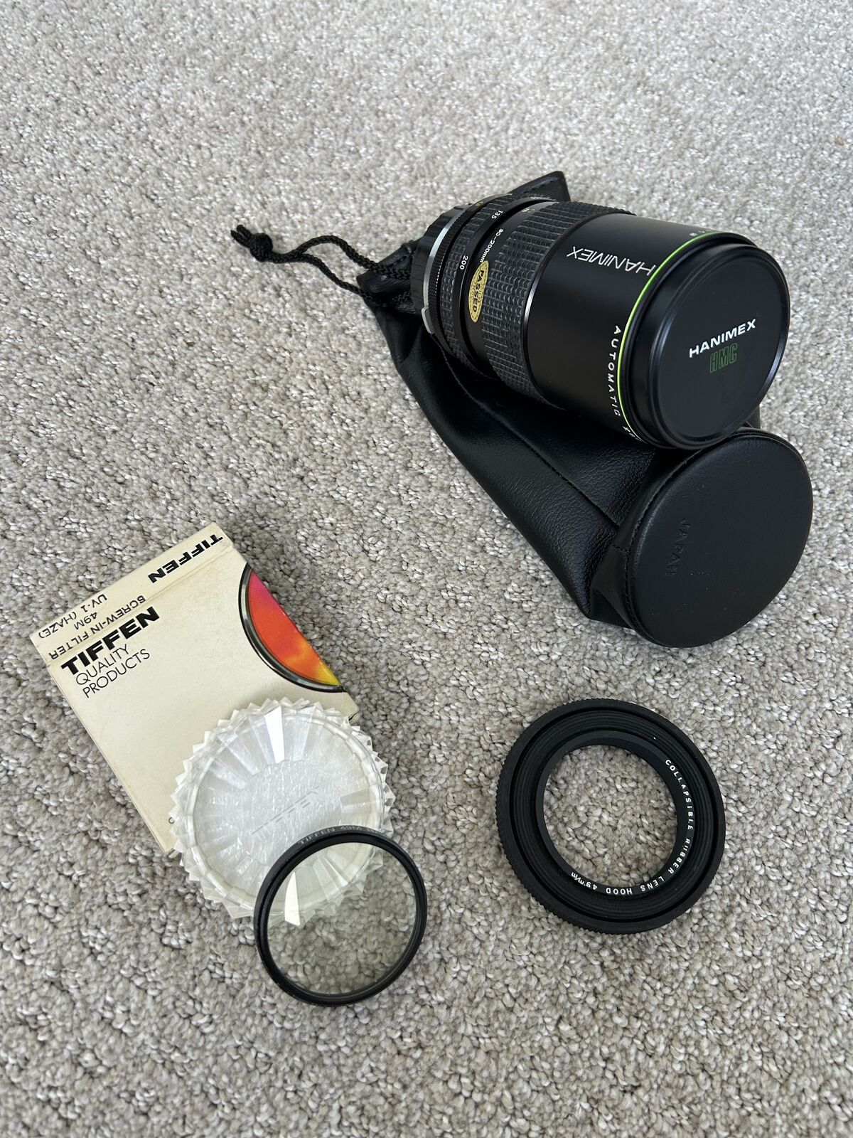 Olympus OM1 35 mm Camera, Hanmex automatic zoom MC f=80-200 mm lens, 2 external flashes, lens filter, lens hood, soft camera case, camera strap and soft camera equipment case. Will need one EXP625 equivalent battery. All items are in very good condition.