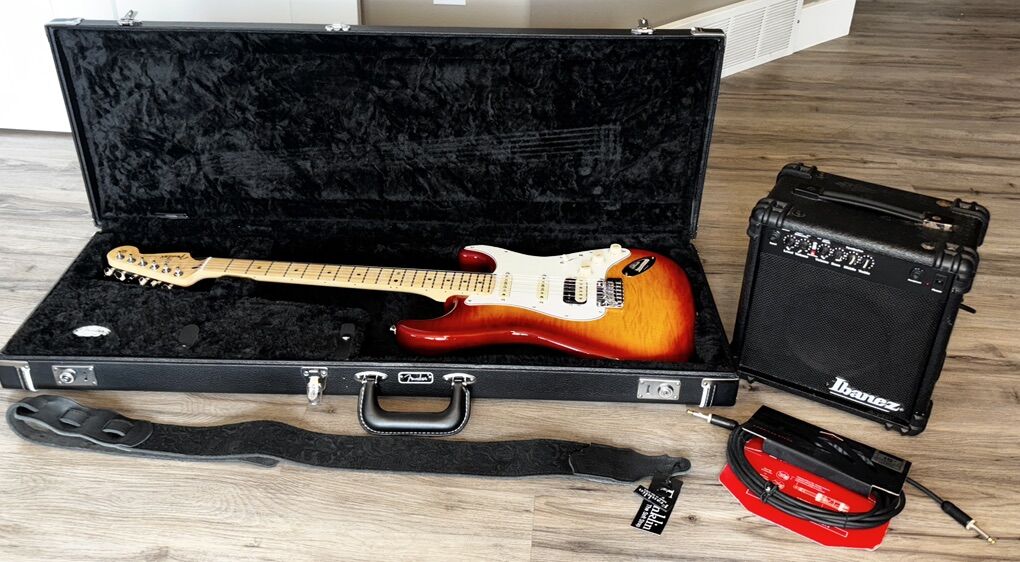 Fender limited edition player Stratocaster HSS plus top Siewre Sunburst MN limited. Includes brand new hard case brand new embossed suede black strap. Amp plus cable. The amp is like new, just a little wear on case from storage. Guitar and case are brand new, never been used. Come from smoke free home Text only 801-502-8107 Cash only -form on price not looking to trade Pick up only located in South Jordan