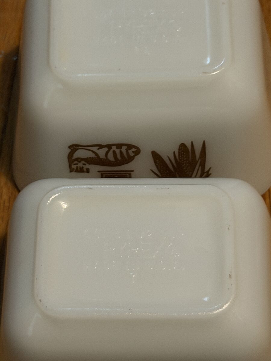 VenmoBoth Pyrex Early American refrigerator dishes and lids are in excellent condition. These are model 501 and 1 1/2 cups. They feature corn, a coffee grinder and a cat. The dish is made of white milk glass with a brown motif.