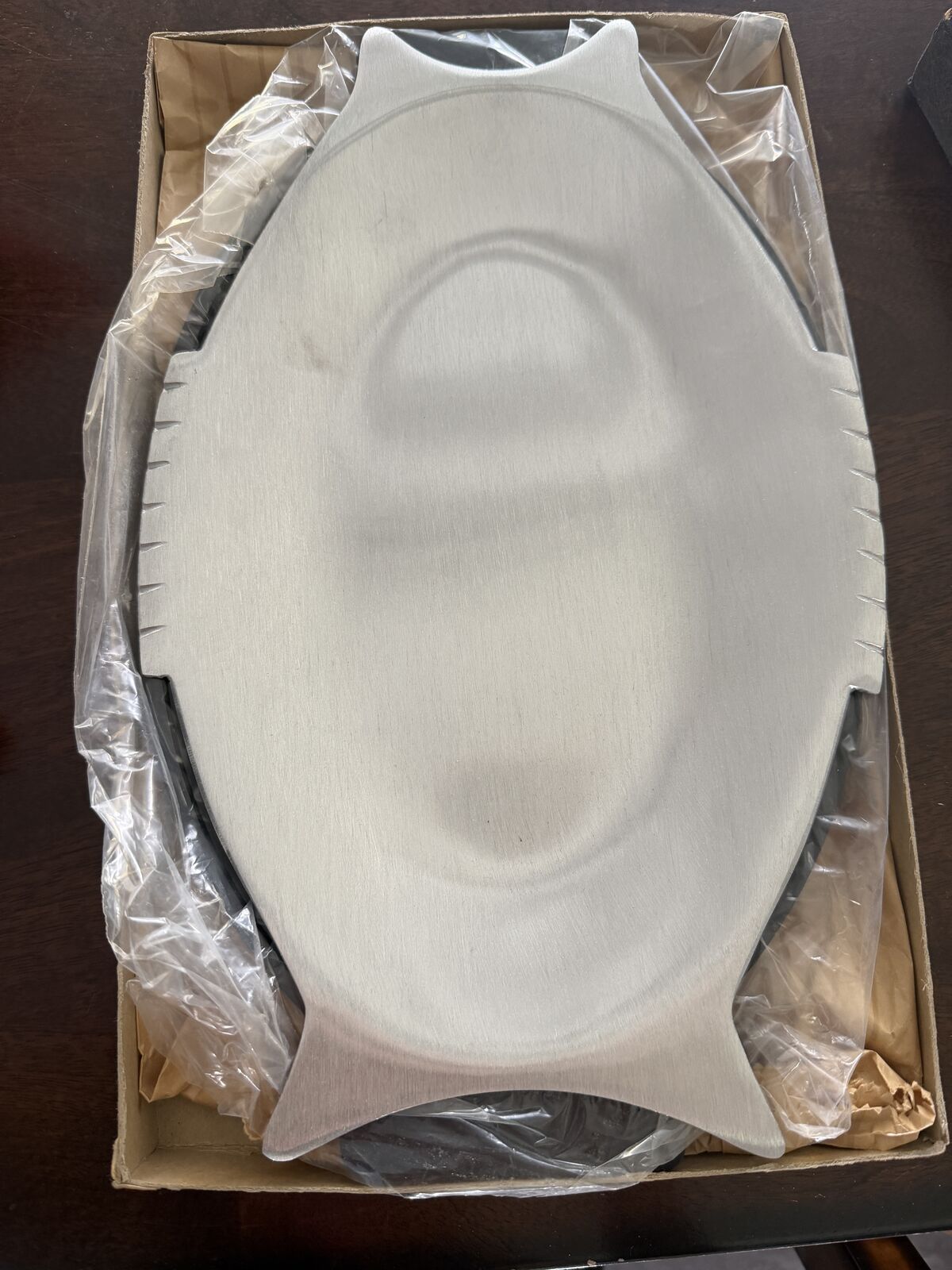 VenmoThis is a heavy sizzling platter set with a Bakelite holder. This can be used to fry or broil food. You can heat just the platter in the oven, stove, or on the BBQ to keep food hot. It can also be placed in the fridge and then cold food can be served on it. It will keep food frosty cold and the holder with catch condensation.