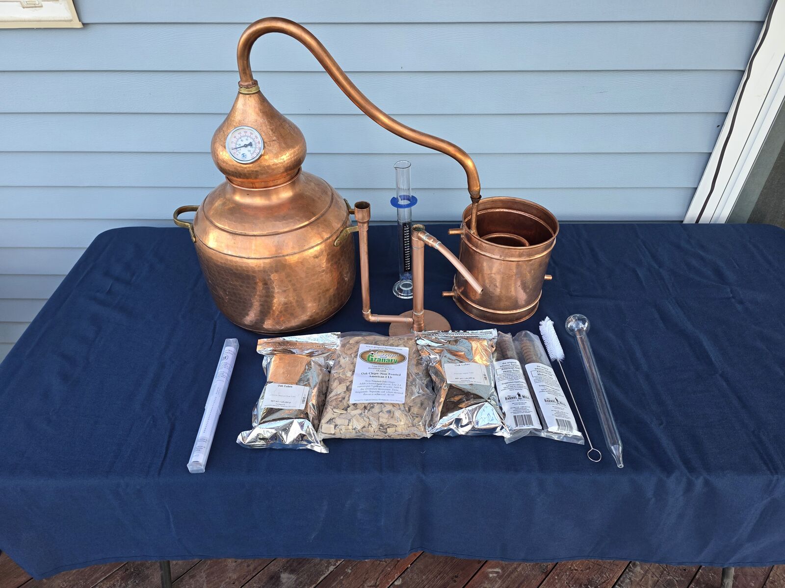 VenmoMOVING SALE. We’re downsizing to a smaller home and must sell all brewing and distilling supplies. $650 OBO. That's basically the cost of the still and proofing parrot with everything else tossed in. The kit includes: •1 5-gallon copper still and condenser coil/can •1 copper proofing parrot •1 wine thief •1 alcoholometer •1 hydrometer •Miscellaneous toasted oak chips and spirals •1 large stainless steel mash tun with thermostat and ball valve drain •1 fruit press (for fruit wines) •1 siphon starter •1 bottling wand •Miscellaneous cleaning equipment, airlocks, etc. •1 cast iron 15,000 BTU propane burner with dual coils and dual controls (it’s sturdy enough to hold the full mash tun) •2 fermentation buckets (one with a drain valve) •1 large fermenter with handles and a drain valve. JAST ADDED: • 2 x 3 gallon carboys • Unopened case of four 32 ounce grolsch-style bottles.