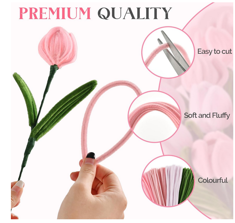 DIY Pipe Cleaners for Flowers Making Set: Effortlessly craft stunning pink pipe cleaner flowers with included floral wires, gardening tape, and stamen, ideal for kids aged 5-12 exploring chenille stems for crafts.