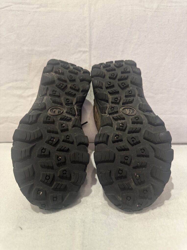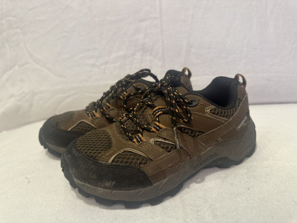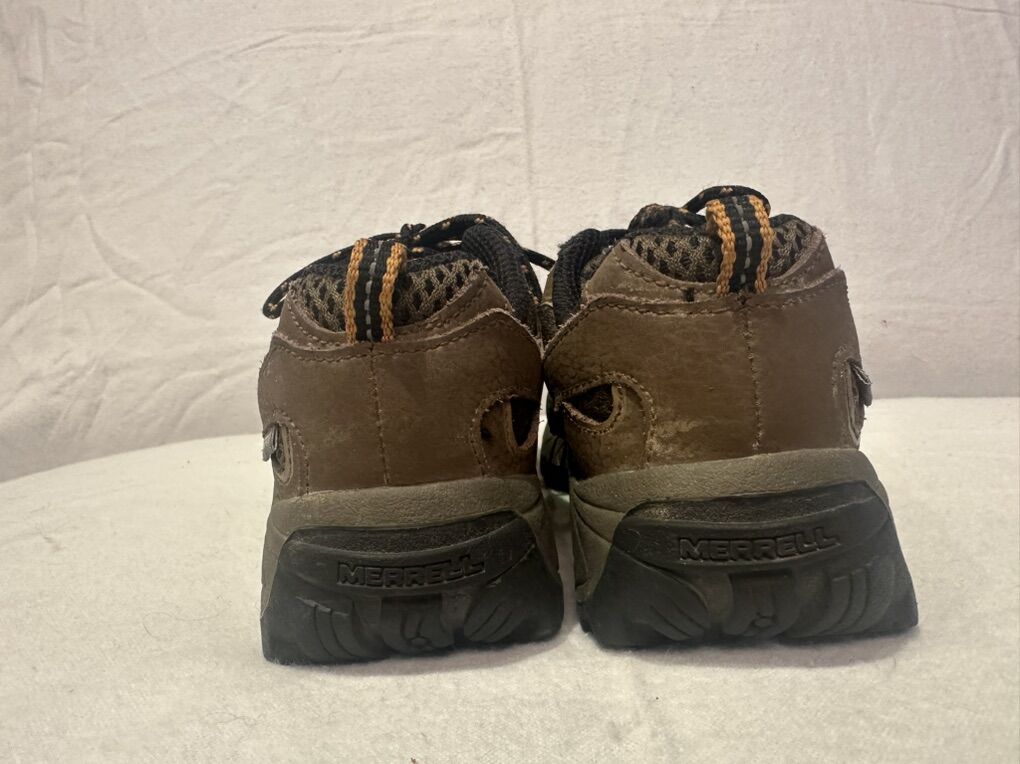 Merrell toddler size 12 M-Moab brown with orange trim, mesh and leather waterproof hiking shoes. These lace up the front and are in good condition. See photos for detail details. I take cash or Venmo, but cash is preferred. Text is best. 801-201-4446. Check out my other ads for additional sizes and styles.