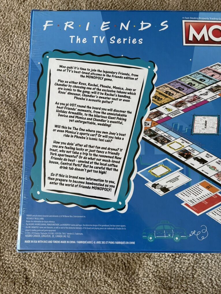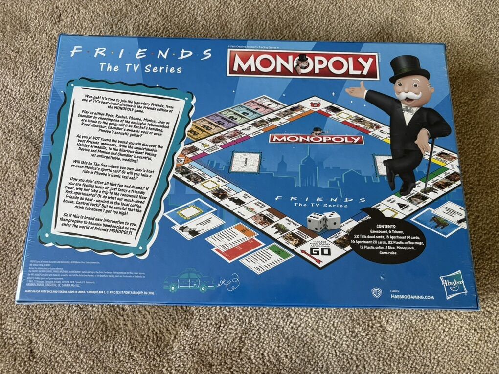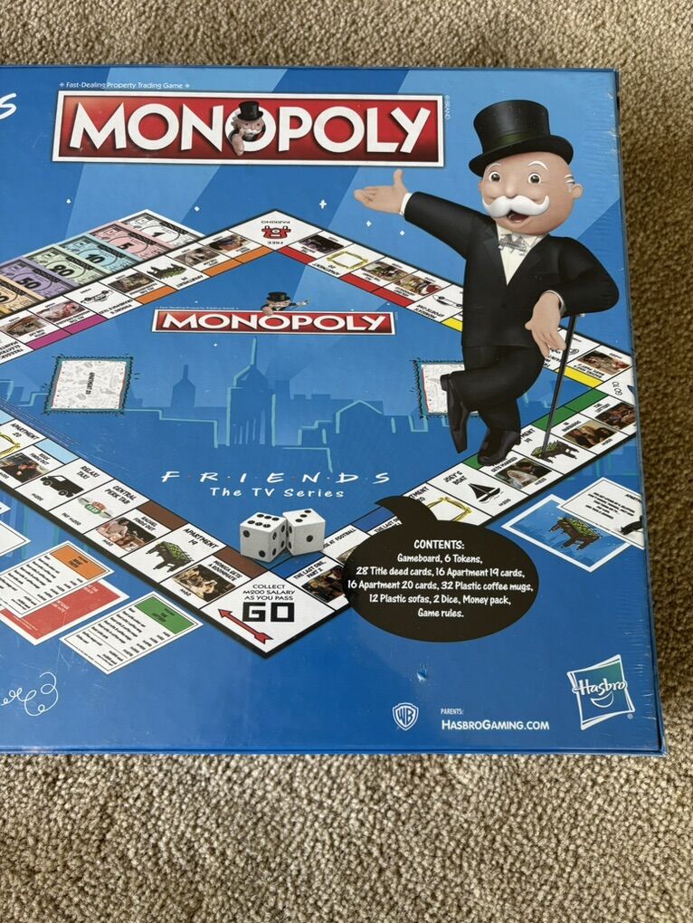 NEW (sealed in plastic) Monopoly: Friends (The TV Series) edition. Fast-dealing property trading game. Ages 8+, 2-6 players. Parker Brothers, Hasbro, 2019. New, unopened condition. Text only. Cash or Venmo. Discount on multiple items.