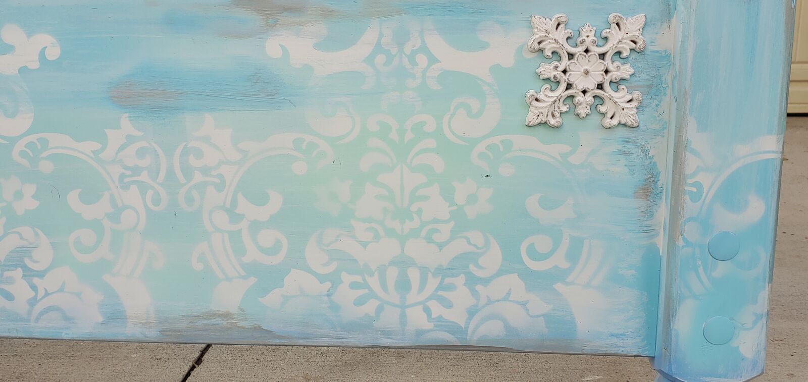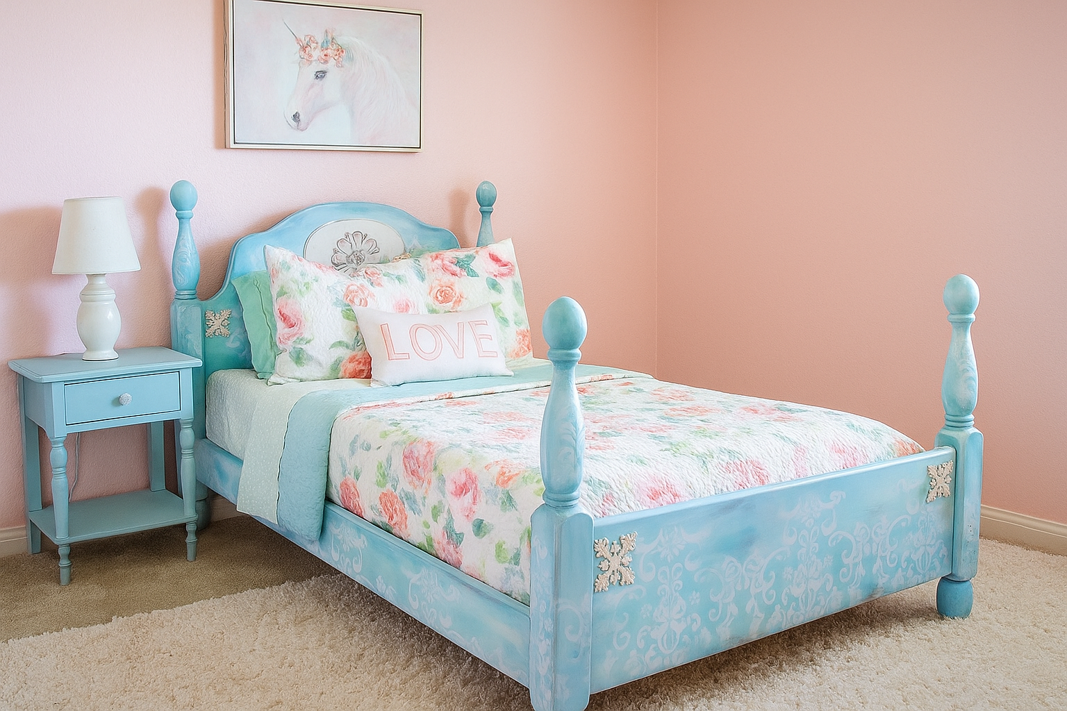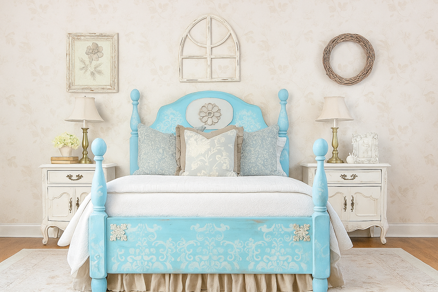SALE! NOW $20% OFF! This UNIQUE bed has recently been made delightful with a new, artistically handpainted finish that features a variegated blend of Robin Egg blues, with faded white brocade designs. It has been enhanced with distressed white carved details. It would be magical as the bed in a Frozen Snow Princess themed room, or a French-style room. It is made with solid wood, and is very sturdy when assembled. ***Included are suggestions of bedding sold online.