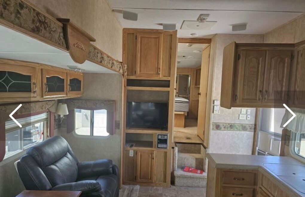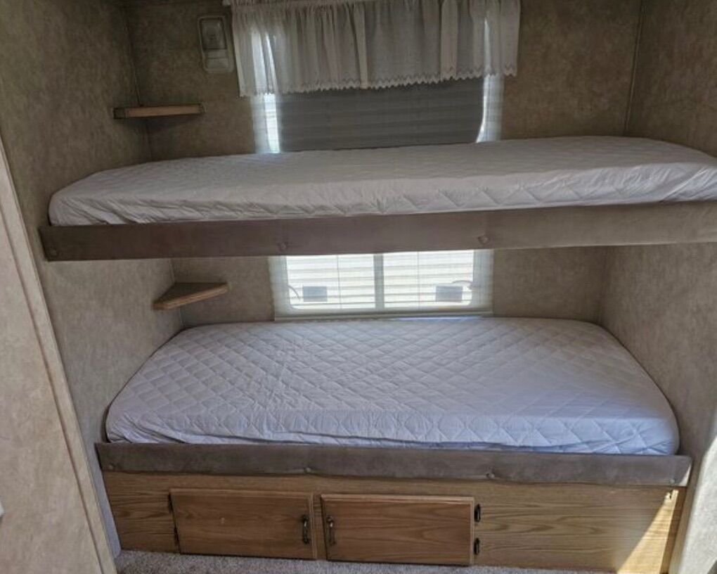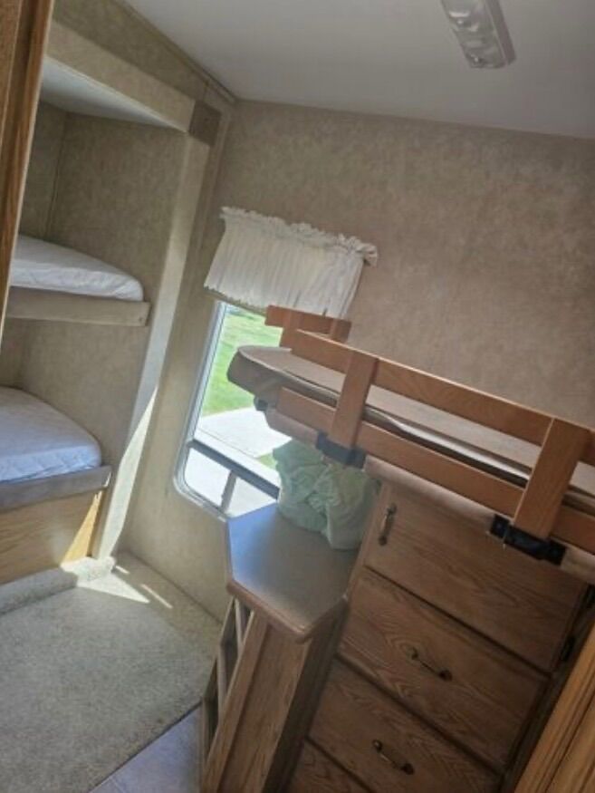 Triple bunks / separate room Hydraulic slide outs ( invincible) 3 huge slides / pop outs Brand new pull out couch/bed and new recliner Added rollout awnings to all the slides new awning above the door last year Immaculate for a 2006 has brand new wheels and 14 ply tires $3k last year. This trailer has minimal use the frame underneath looks like a 2020 with barely surface rust been stored inside most of its life Brakes and bearings have been redone last year, new toilet this season. Tinted windows For asking price it comes with generator Empty weight 10,180 Gvwr 13900 Has lippert 7k axes We have 2 trailers this one and a little 17’ bumper pull just trying to sell either or.