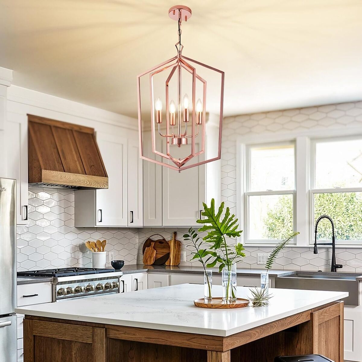 Retailer's titile: WJShome 18.1" Rose Gold Chandelier, 4-Light Farmhouse Dining Room Light Fixture, Industrial Ceilings Foyer Lighting Fixtures, Rustic Lantern Pendant Light, for Kitchen Island, Entryway, Staircase