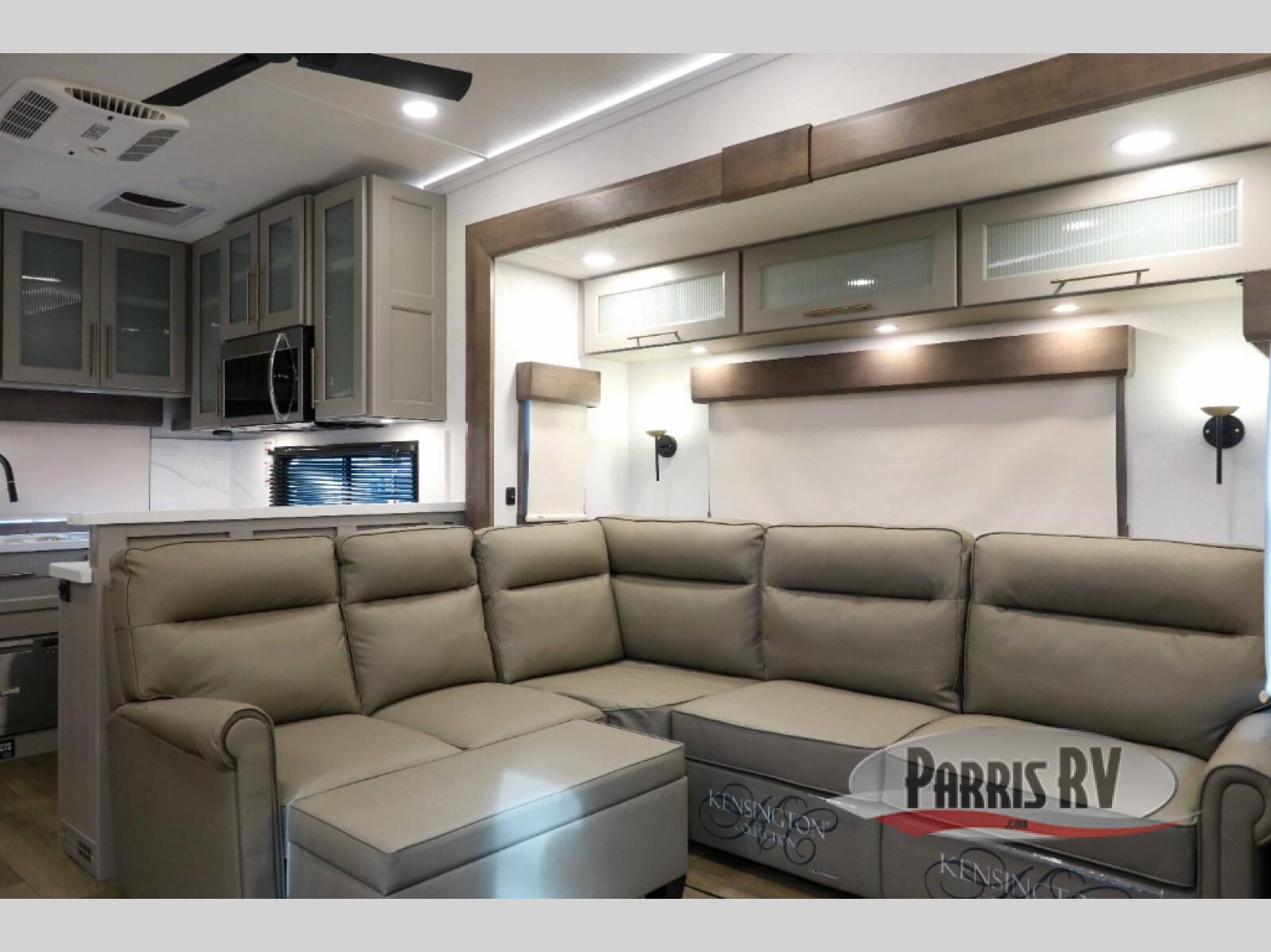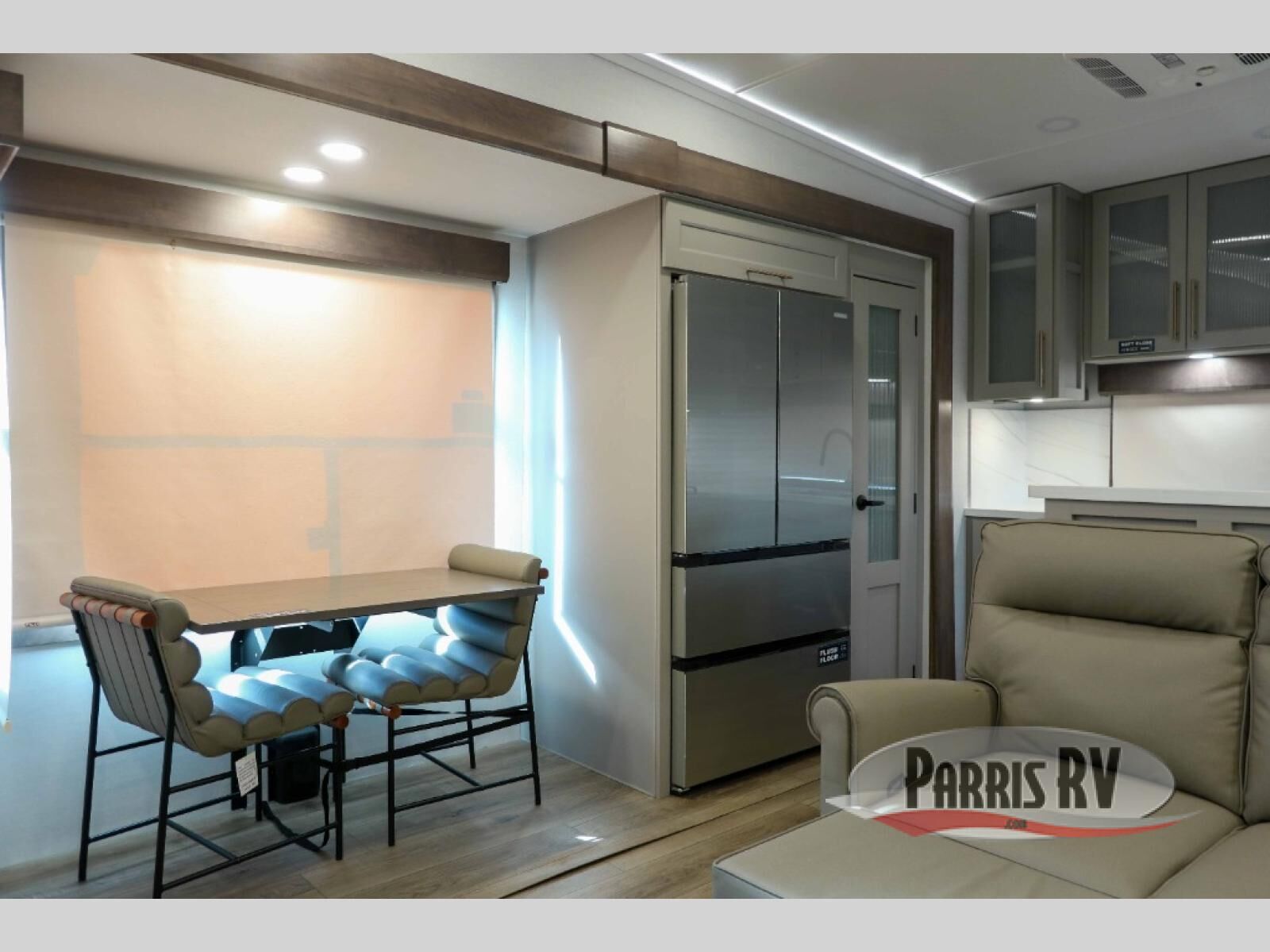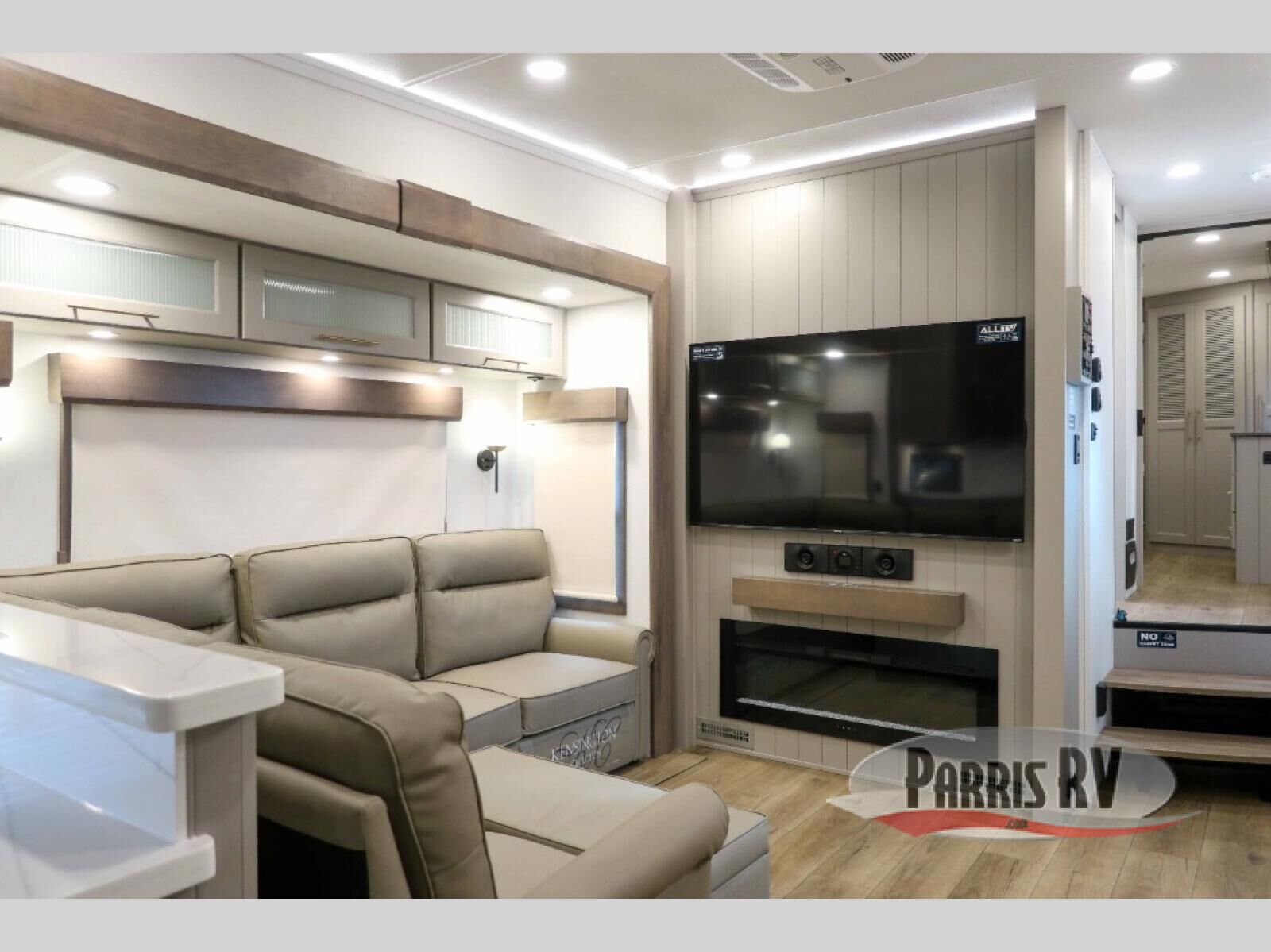 Escape the ordinary and experience the ultimate in luxury travel with this stunning fifth wheel! The rear kitchen is the heart of this fifth wheel, featuring a spacious pantry, 12V refrigerator, microwave, and overhead cabinets. Prepare delicious meals with ease and enjoy the convenience of a fully-equipped kitchen. Unwind in the spacious living area, featuring a plush trifold sofa, L-shape sofa, and a dual recliner love seat. Gather around the turntable dinette or relax in front of the stunning 65" TV. The full bathroom provides a serene space for personal care, while the front bedroom is a peaceful retreat with a comfortable queen bed and a flip-top dresser. Enjoy your favorite shows on the smart TV, perfect for relaxing after a day of adventure.