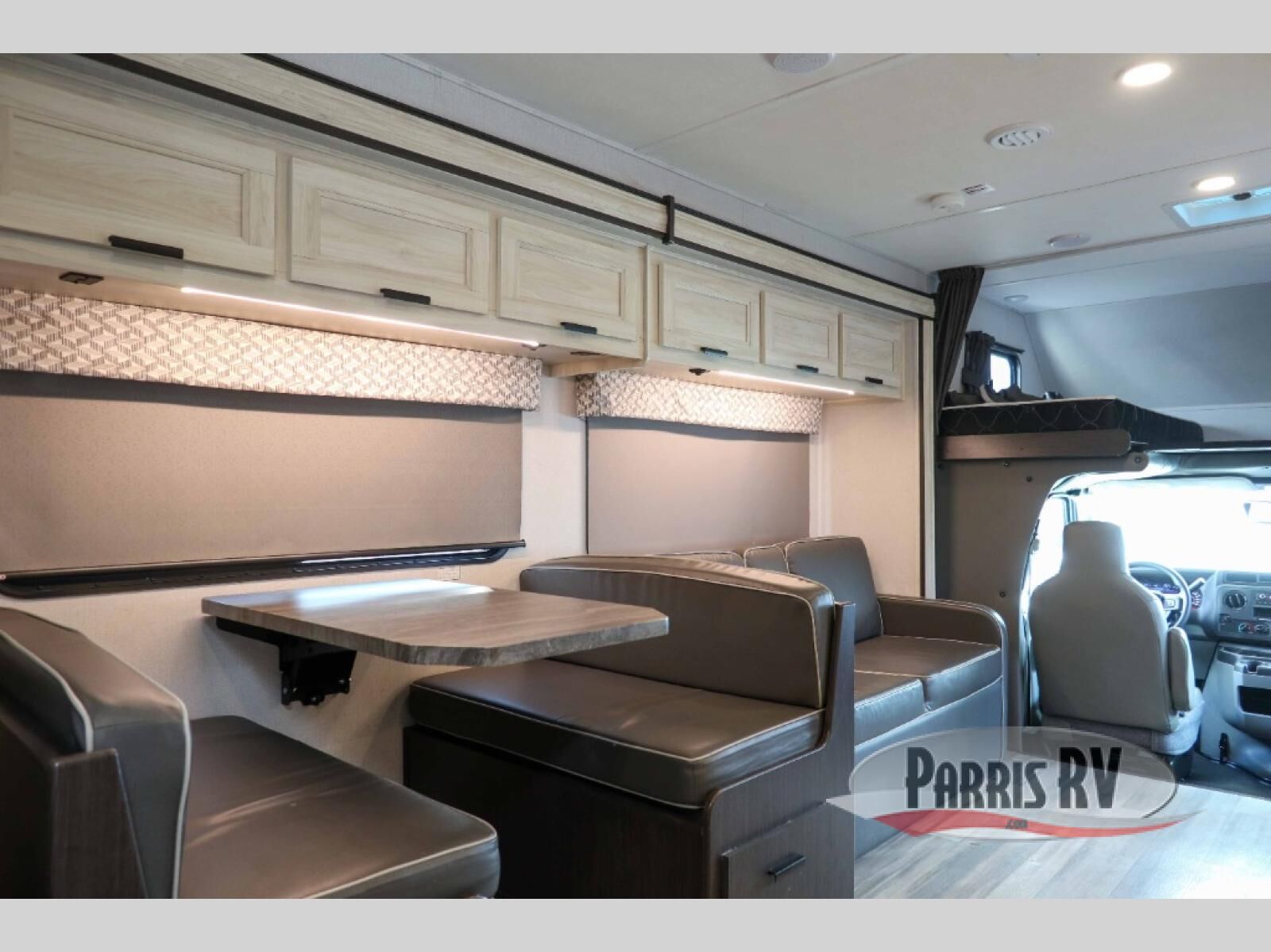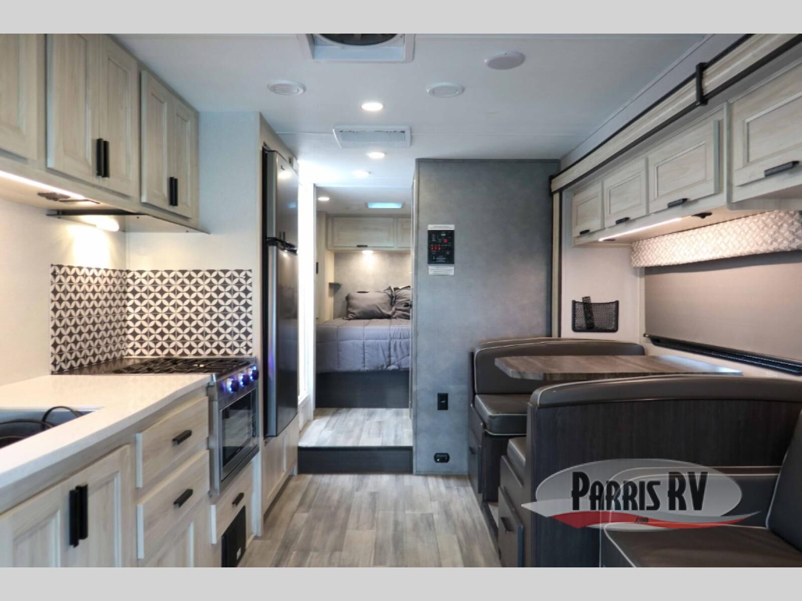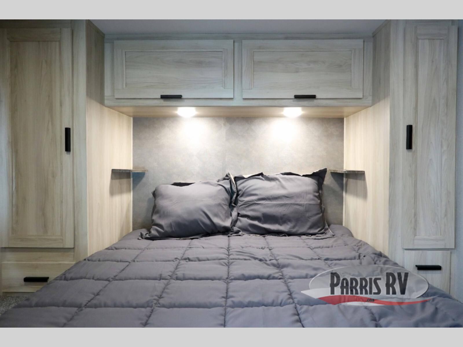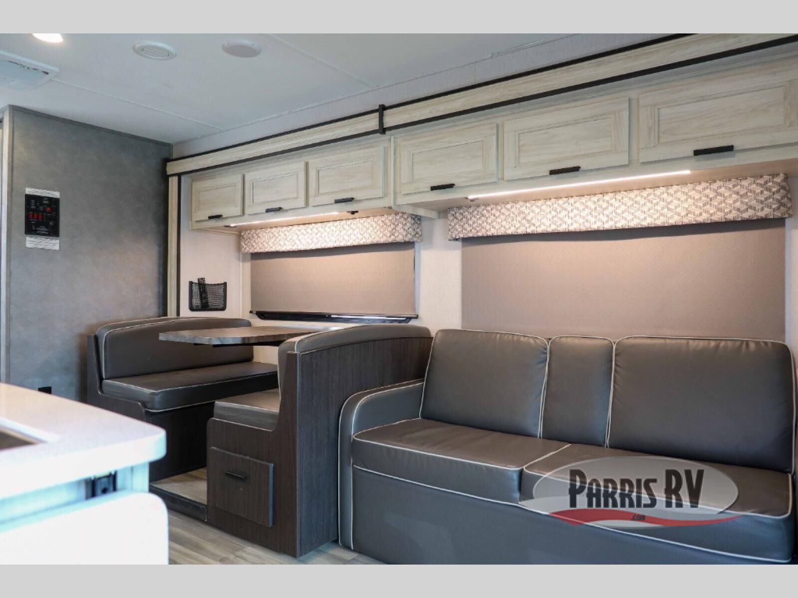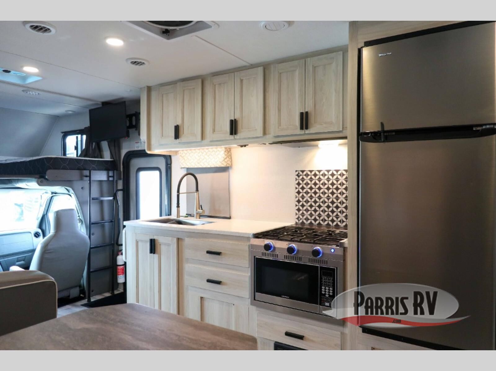 You and your favorite person will love this coach for many reasons including having your own private bedroom with a split bathroom, a walk-around queen bed, plus your own wardrobe. The split bathroom is pretty handy since one person can get ready in the private toilet and sink room while another is taking a shower. The kitchen offers a 10.7 cu. ft. 12V refrigerator, a convection microwave, a recessed three-burner range, soft touch self-closing drawer guides and a cordless 12V charging plate. You will have overhead cabinets and a pantry for storage. The slide out sofa and booth dinette offer a great place to relax and dine plus gives you more floor space. And the queen bunk over the cab will be a popular sleeping space for overnight guests.