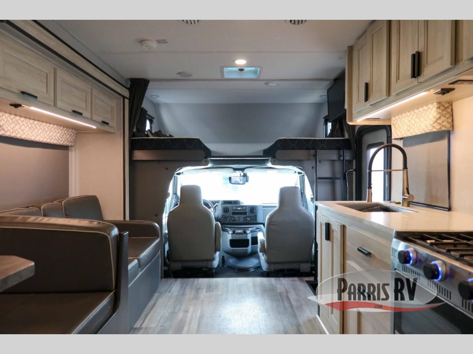 With any Forester LE Class C gas motorhome by Forest River, you will enjoy premier features such as the color back-up camera/side view cameras with a rear view mirror monitor, the Winegard Air 360+ digital antenna, and the 15,000 BTU ceiling ducted, ultra quiet roof air with a heat pump when traveling during the warmer months. The exterior includes aluminum framed laminated sidewalls, gel coat exterior fiberglass, a one-piece fiberglass front cap, and slide room toppers. Some of the interior top features are the Maxx Air multi-speed power fan with a cover in the kitchen, the overhead bunk ladder, the high pressure oxygen infused shower head, and the blackout roller shades for a good night's sleep. Make your selection today!