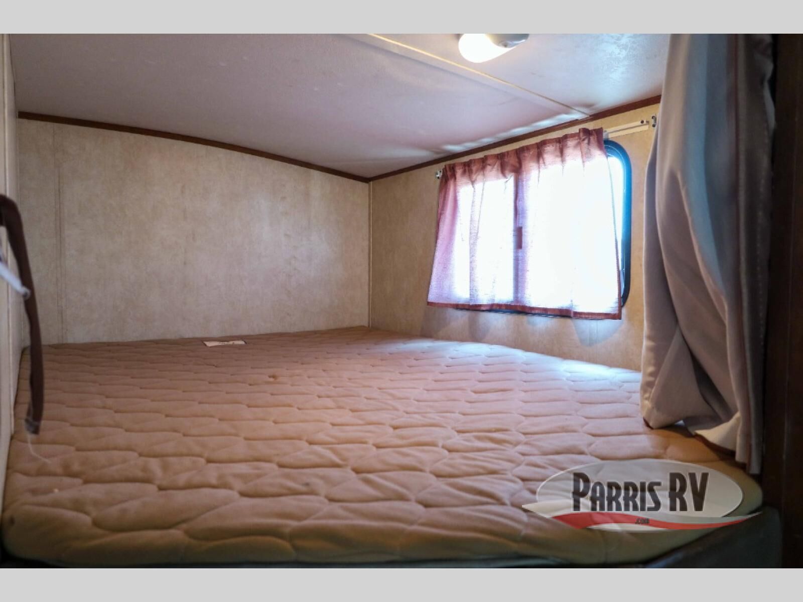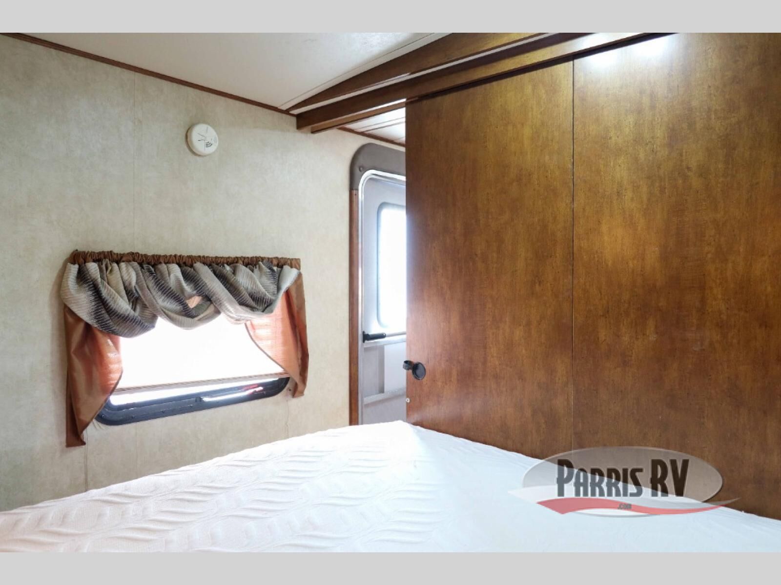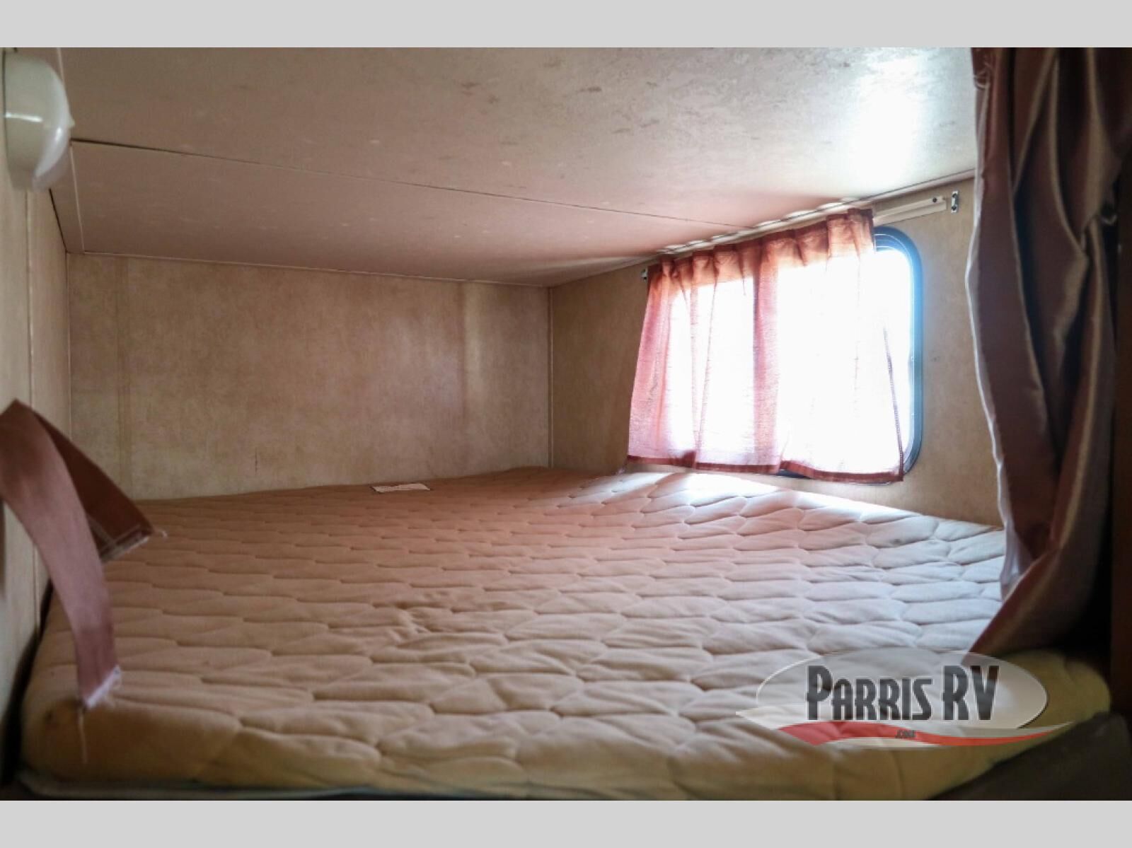 In the rear of the travel trailer, you will find a set of double beds. Beside the beds is a wardrobe/pantry.