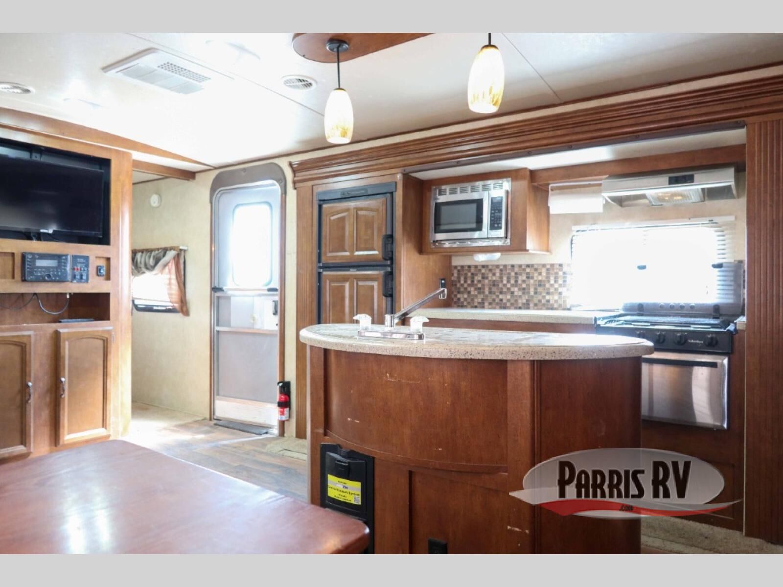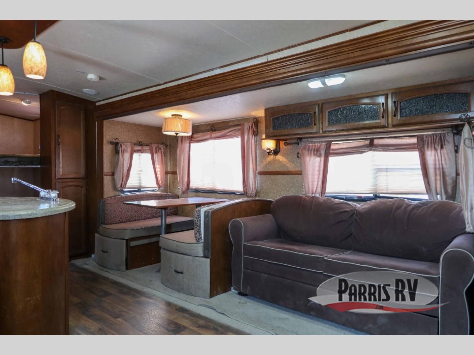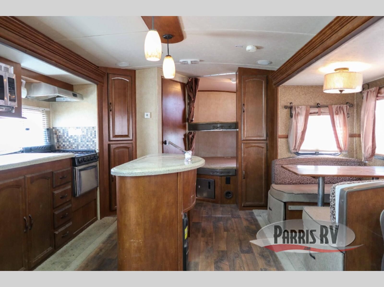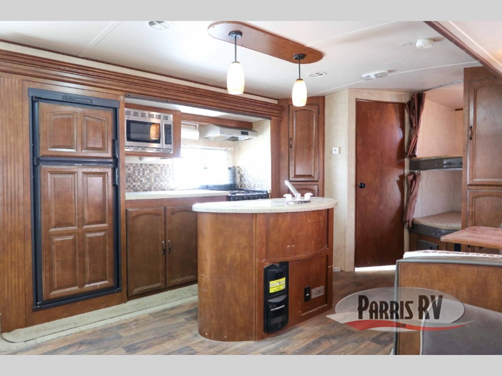 As you enter the 282BHIS travel trailer, to the left is a slide with a refrigerator, microwave, and three burner range. In the corner is a cabinet. The other slide has a dinette and hide-a-bed sofa. There is also a kitchen island with a double kitchen sink and extra counter space. Along the front of the living area you will find an entertainment center.