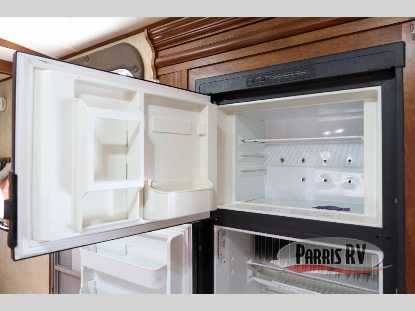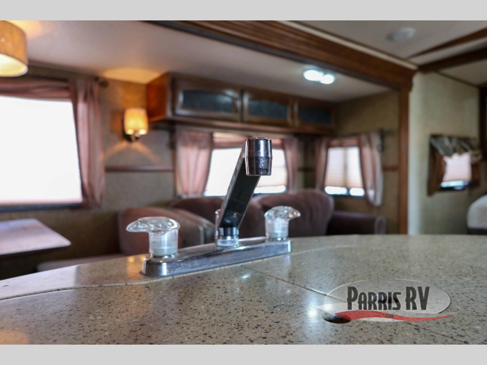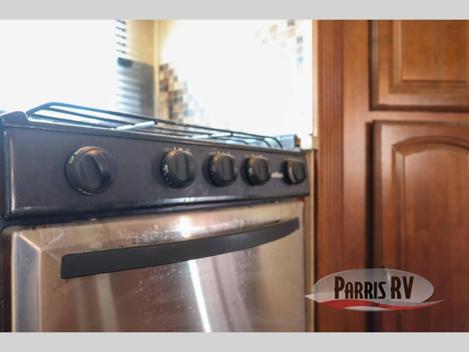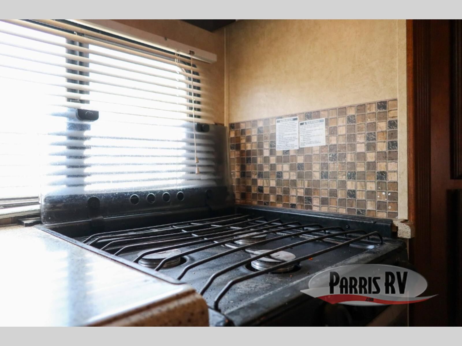 As you enter the 282BHIS travel trailer, to the left is a slide with a refrigerator, microwave, and three burner range. In the corner is a cabinet. The other slide has a dinette and hide-a-bed sofa. There is also a kitchen island with a double kitchen sink and extra counter space. Along the front of the living area you will find an entertainment center.
