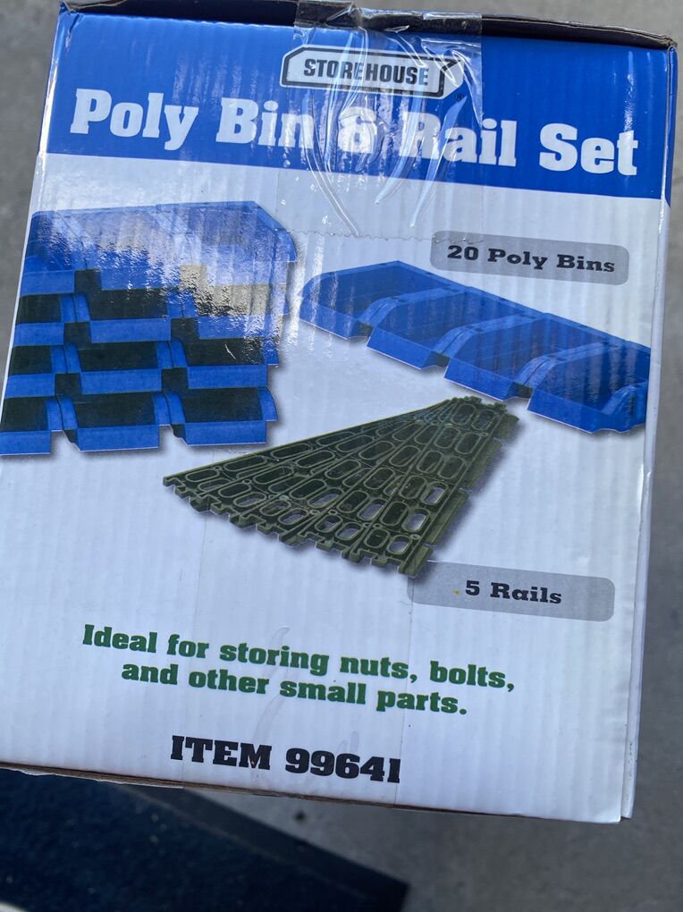 20pc poly bin and rail set by Storehouse. (New in Box) Ideal for storing nuts and bolts and other small parts. Can be wall mounted.