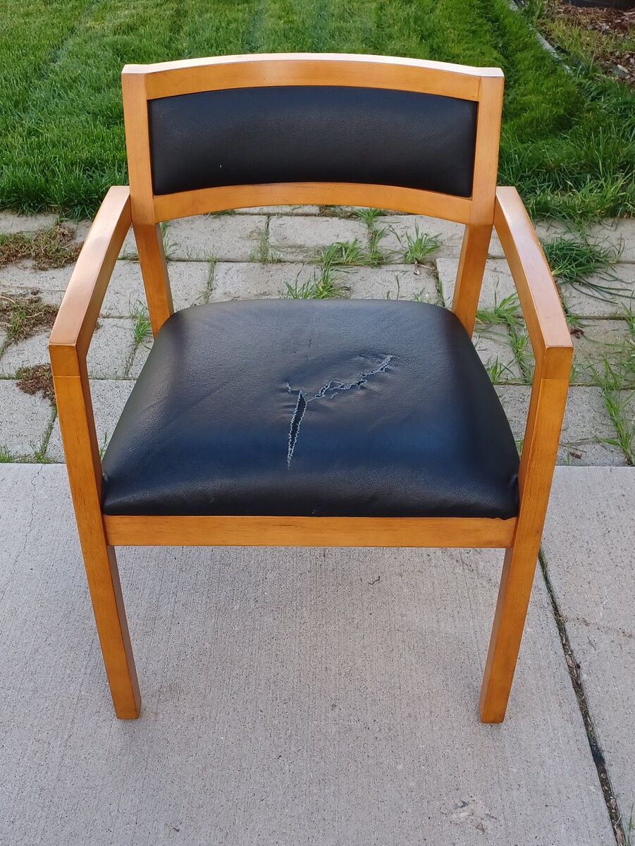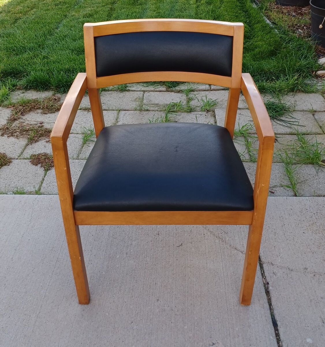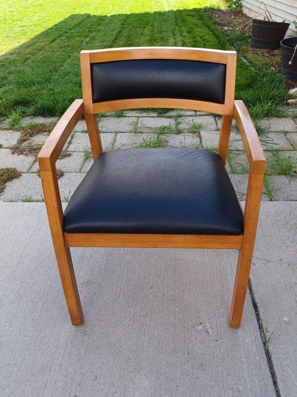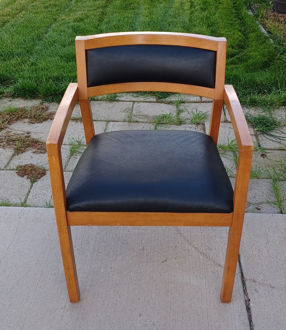Five black mid century faux leather side chairs with wood frames and curved backrest. Seat is 20 inches wide, 18 inches long. Chair is 31 inches tall.