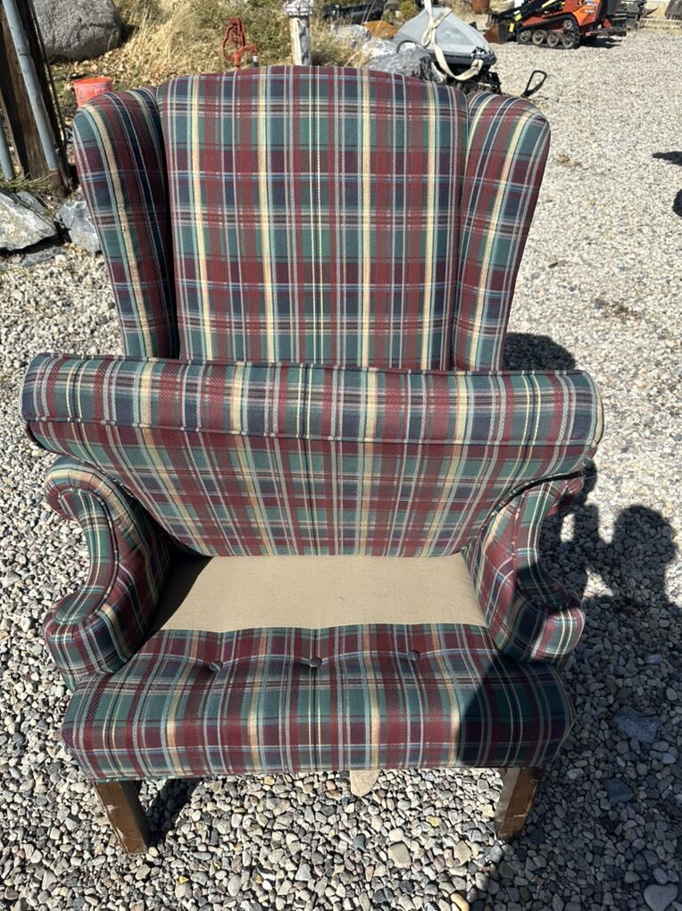 • Traditional wingback design • Rich plaid upholstery with warm tones • Solid wood legs with vintage finish • Comfortable cushioning and supportive back