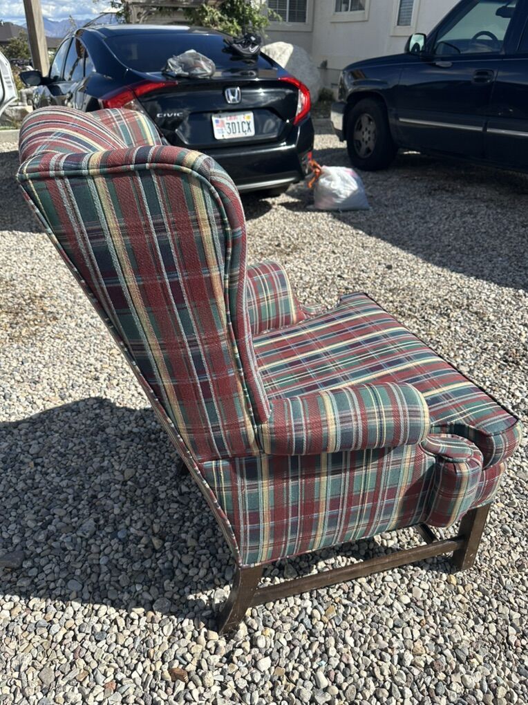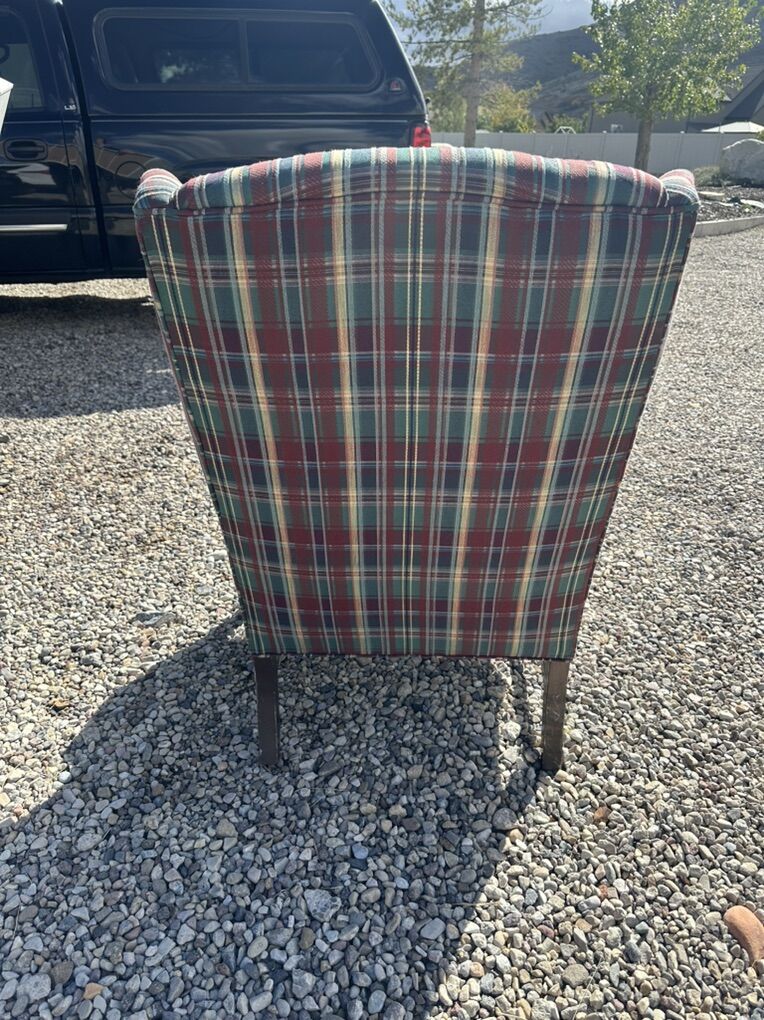 Add a touch of classic elegance to your space with this vintage wingback chair, upholstered in a charming plaid fabric. Its high back, rolled arms, and sturdy wooden legs make it the perfect reading nook companion or statement piece for any room.