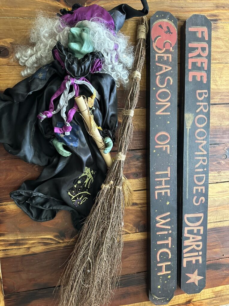 If you are a witch lover!! This package is for you. 1- Witch light that can hang and plugs in. Has a green bulb put you can add the one you like. 1- Witch that is holding a broom. About 26” tall and it soft body. 1-a 36” straw broom. 2- signs —“Free Broom Rides—Dearie” 2- signs—“Seasons of the Witch” Selling as a full package only $25.00