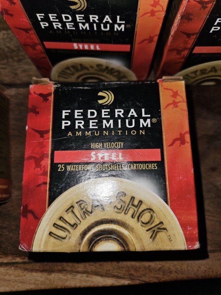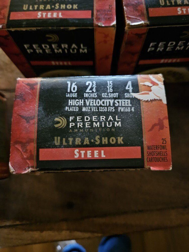 I have 5 boxes of Federal Premium ammunition high velocity steel waterfowl shotgun shells with 25 per box. 16 gauge, 2-3/4", 15-16 oz. shot, 4 shot. Price per box is $25 or $110 for all five boxes. See pictures for details.