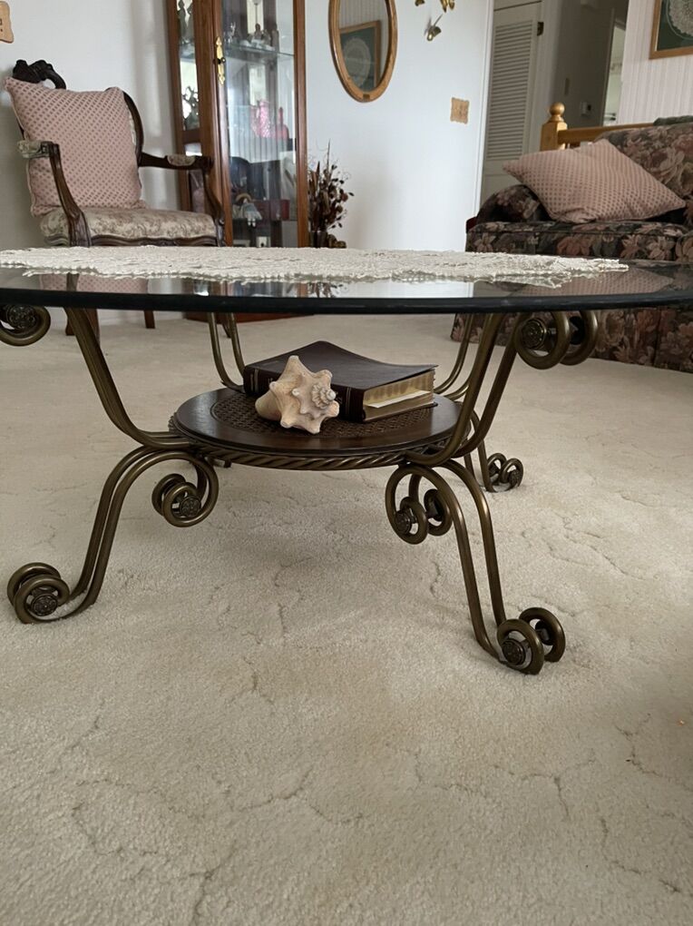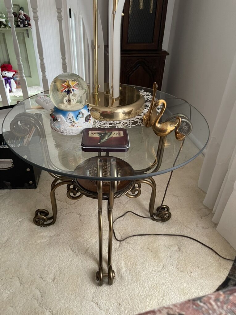 VenmoI can totally see these tables as a centerpiece in a luxurious living room or office. With a solid brass curve of the legs and the top where it touches the glass table part just makes it stunning. With the added end tables, one square and one round just makes the room perfect. The large round coffee table is 42 inches in diameter $100 and the two end tables are 24 inches in diameter. $60 each. Or take all three for $200 They are very heavy and well made. They come from a smoke free pet free home. Please don’t ask me if they are still available because I won’t respond. FCFS Or Venmo to hold