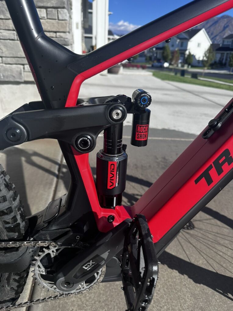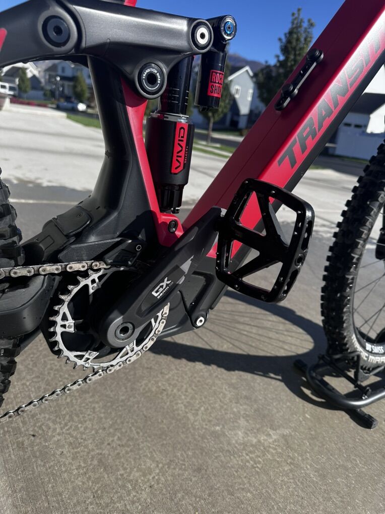 This is the GX build, but I upgraded the fork parts to be the Zeb Ultimate ($450). I also upgraded the brakes to SRAM Maven Silver with 220/200 rotors ($600). PNW Loam carbon bars, PNW XL grips, and PNW Range pedals (all for about $250). New red headset to match the frame.
