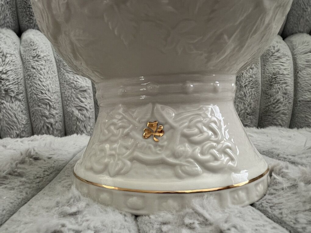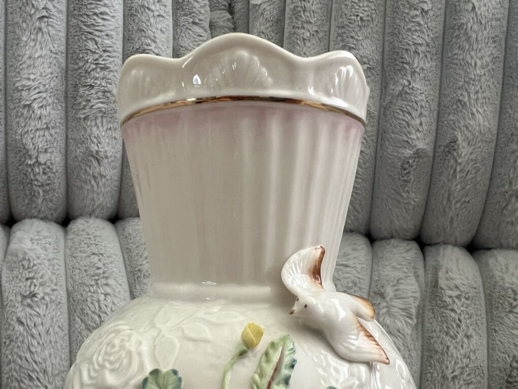 2- is The Belleek Song Bird Vase with gold rim 150th anniversary piece. This vase measures approx 10” https://theirishgifthouse.com/contents/en-us/p9800_Belleek-Vase-Songbird.html