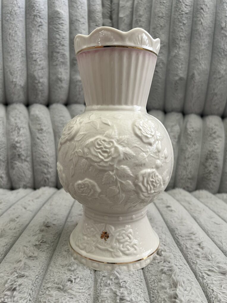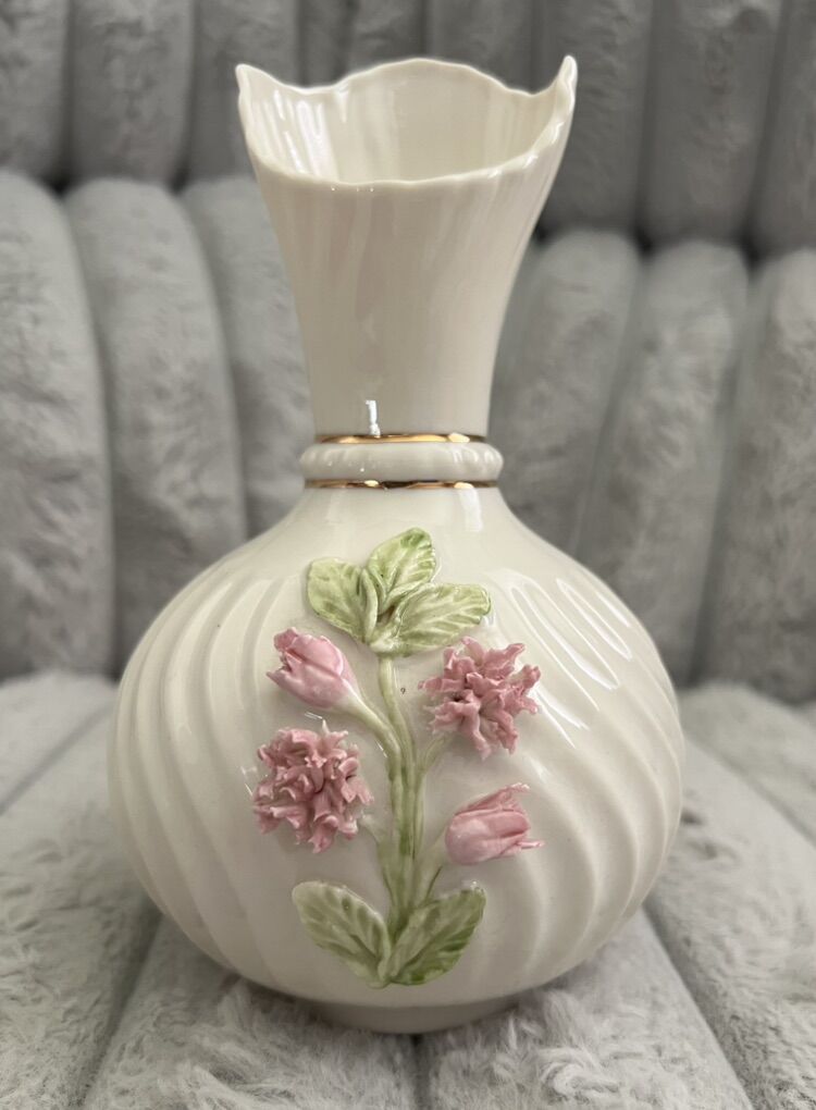 3- Belleek Scroll Flower Pink Irish Porcelain Vase with a gold rim. Measures approx 7”