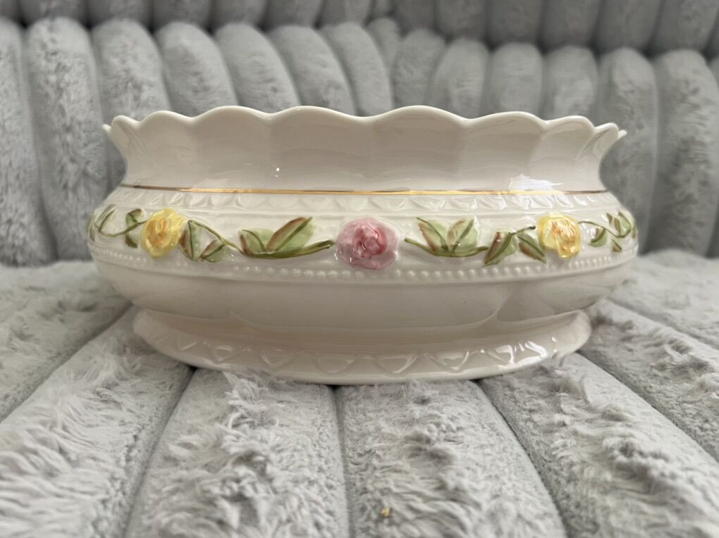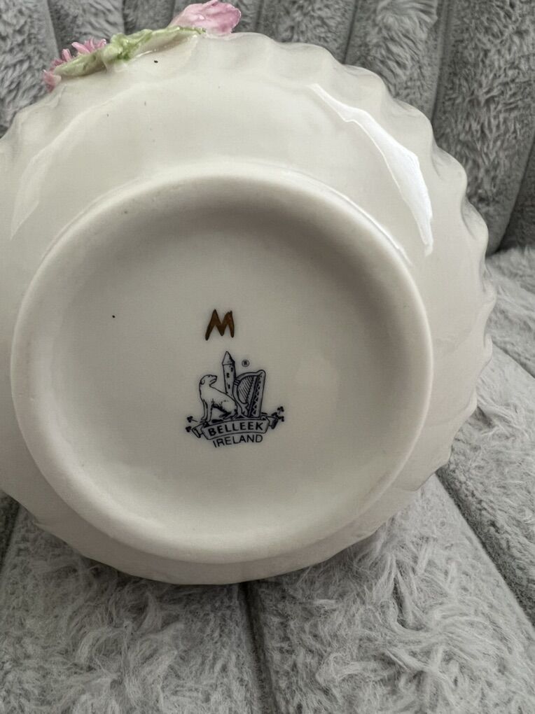 1- large Belleek Dalriada Fruit Bowl with gold rim. This bowl has beautiful flowers all the way around. It measures approx 10 inches wide and 4 inches deep. This is a link with full description. https://www.replacements.com/china-belleek-pottery-ireland-classic-rose-collection-centerpiece/p/47115021