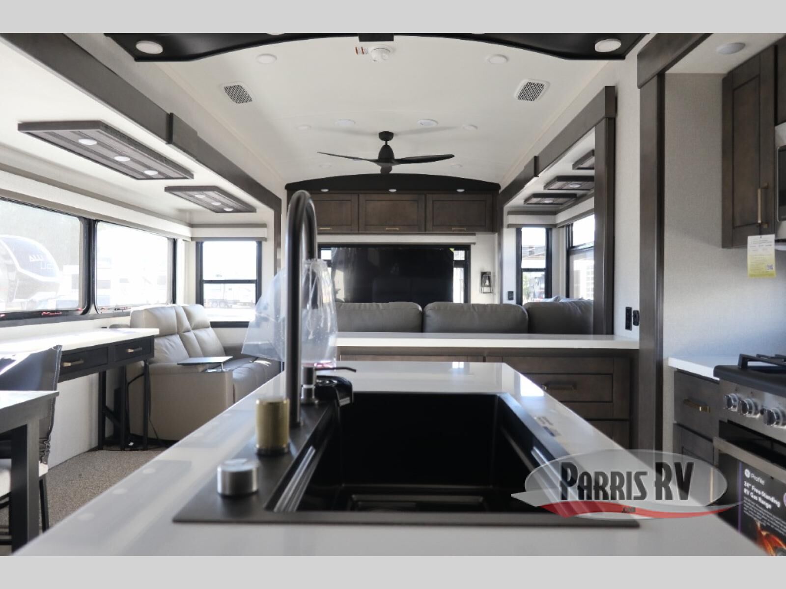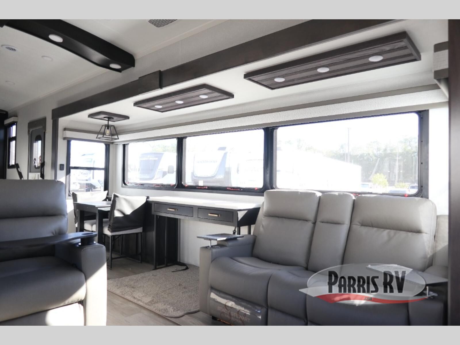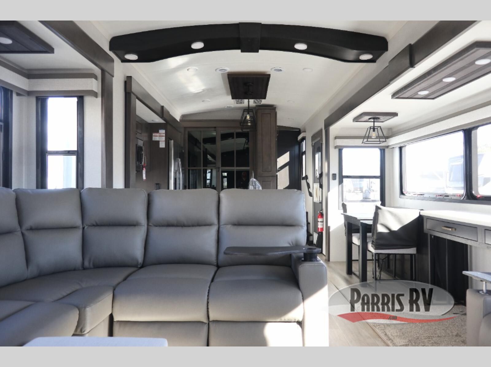 At the front of this 38RE layout, you'll find a private bedroom featuring a spacious 72" x 80" king bed slide-out, creating a comfortable retreat to rest and recharge. The room also includes a wardrobe and dresser with a TV above, providing ample storage for clothing and essentials. Moving down the hall, the full bathroom offers both comfort and convenience with its 36" x 48" shower complete with a built-in seat for accessibility, plus linen shelves for added storage. At the heart of the unit, the kitchen is thoughtfully designed with everything needed to cook in comfort, including a pantry, a pull-out cutting board in the island, and a 21-cu. ft. refrigerator. Meal preparation is a breeze with the 24" range or the convection microwave featuring a built-in air fryer. Across from the kitchen, the large slide-out hosts a roll-out table perfect for dining or game nights, as well as a desk/coffee bar and cozy theater seating. At the rear, the entertainment center stands out with a TV lift and fireplace, while the L-shaped lounge and additional theater seat create the ultimate space to relax and enjoy movie nights in style.