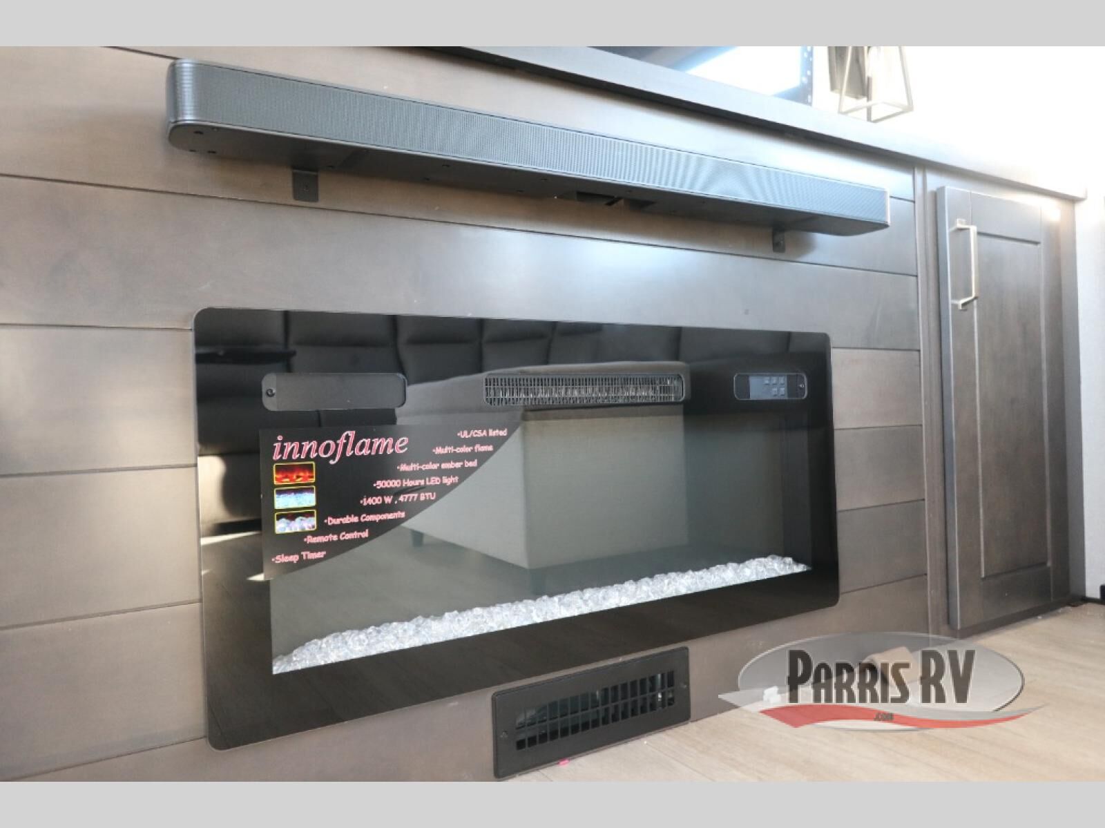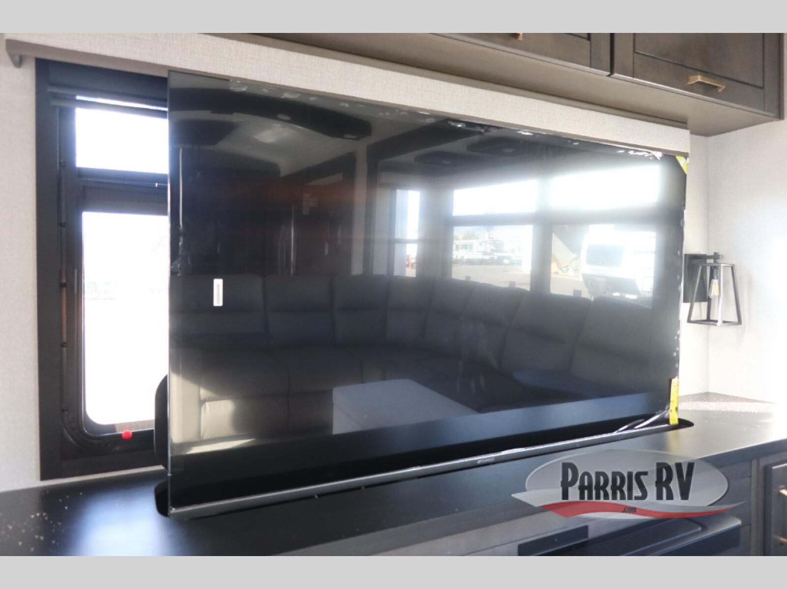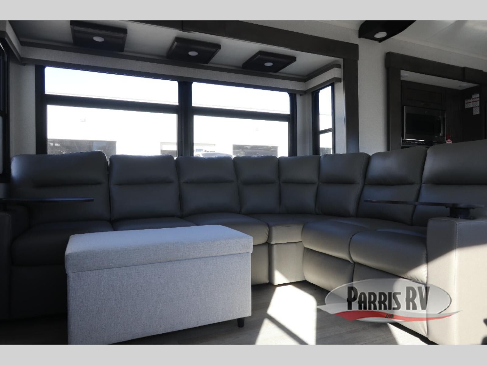 At the front of this 38RE layout, you'll find a private bedroom featuring a spacious 72" x 80" king bed slide-out, creating a comfortable retreat to rest and recharge. The room also includes a wardrobe and dresser with a TV above, providing ample storage for clothing and essentials. Moving down the hall, the full bathroom offers both comfort and convenience with its 36" x 48" shower complete with a built-in seat for accessibility, plus linen shelves for added storage. At the heart of the unit, the kitchen is thoughtfully designed with everything needed to cook in comfort, including a pantry, a pull-out cutting board in the island, and a 21-cu. ft. refrigerator. Meal preparation is a breeze with the 24" range or the convection microwave featuring a built-in air fryer. Across from the kitchen, the large slide-out hosts a roll-out table perfect for dining or game nights, as well as a desk/coffee bar and cozy theater seating. At the rear, the entertainment center stands out with a TV lift and fireplace, while the L-shaped lounge and additional theater seat create the ultimate space to relax and enjoy movie nights in style.