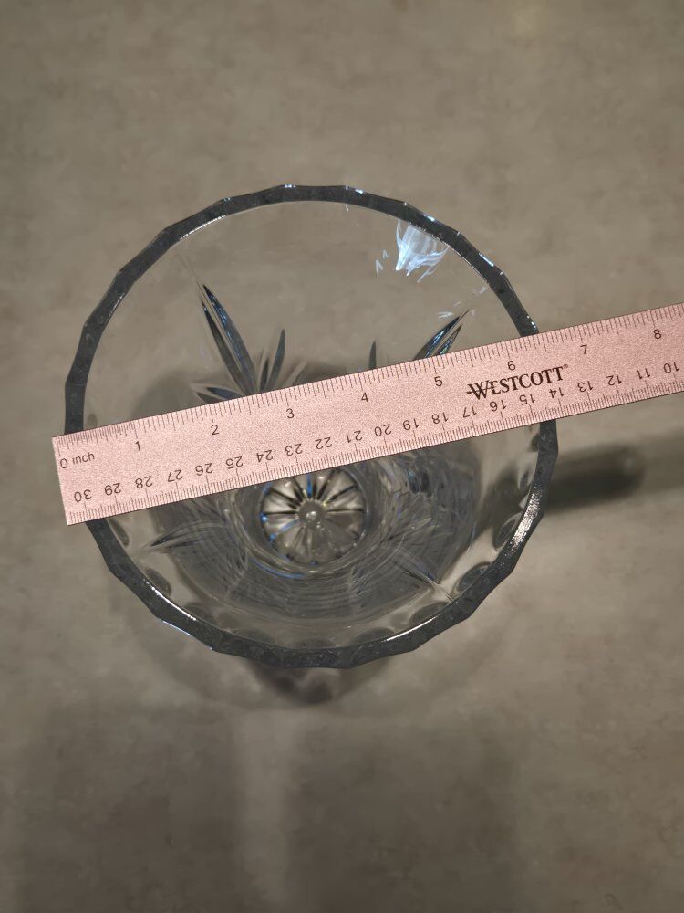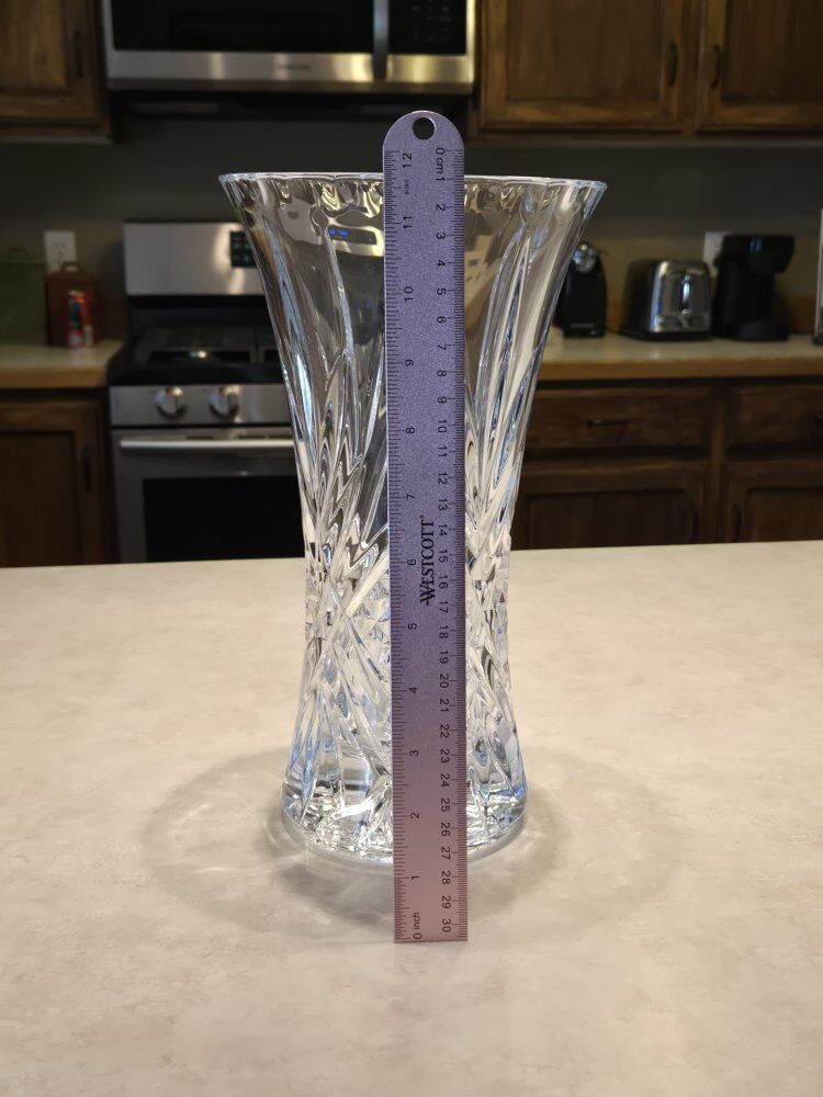 Large Crystal vase. Perfect condition. 11.5 inches tall, 6.5 inches diameter. Never used. Displayed only.