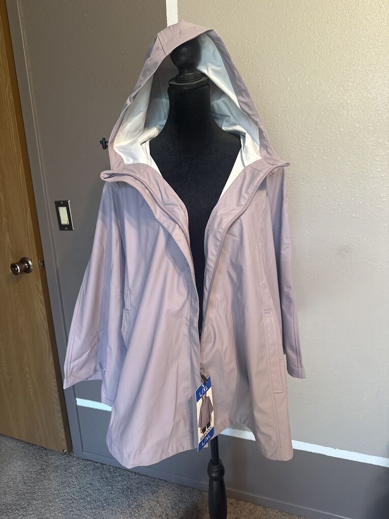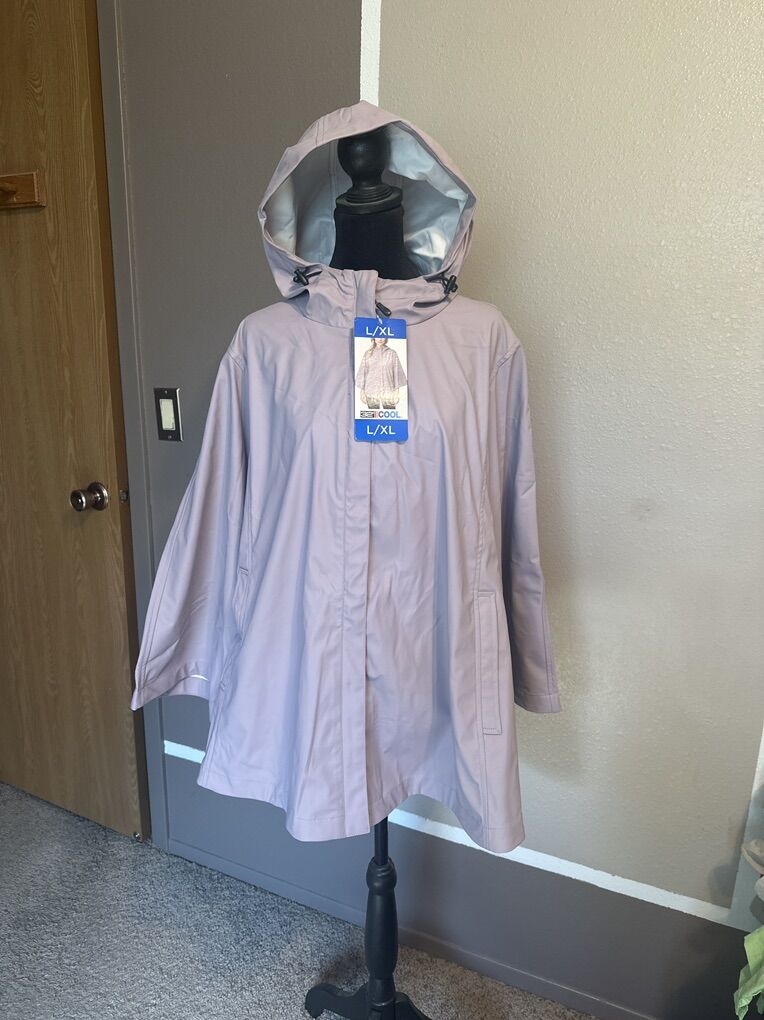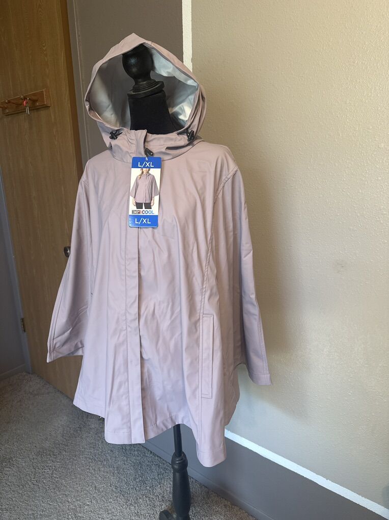 Rain& wind 32 degree. New with tag and high quality . I have S/M and L/XL size in three color ( light purple , what you see in the picture, light gray and black)