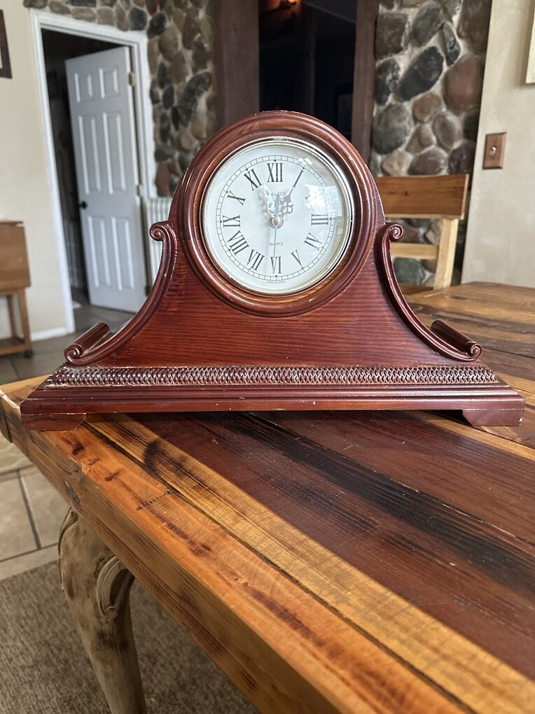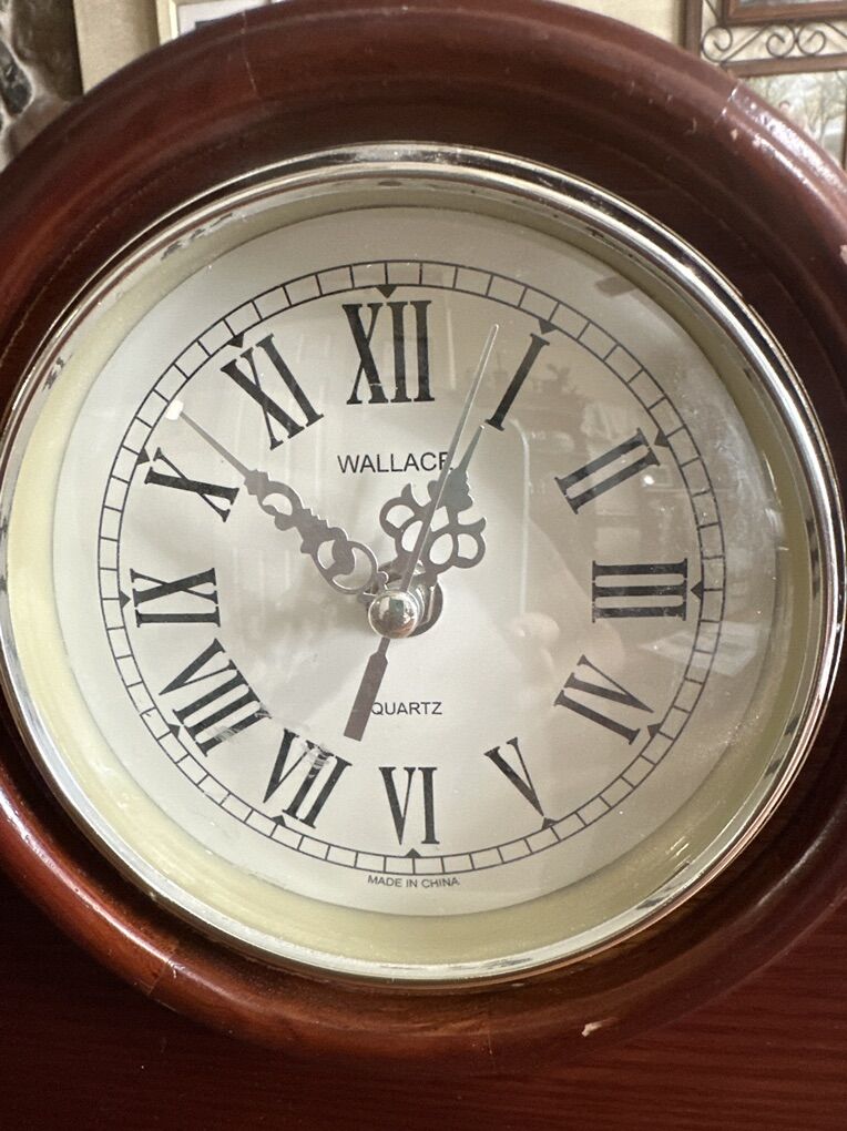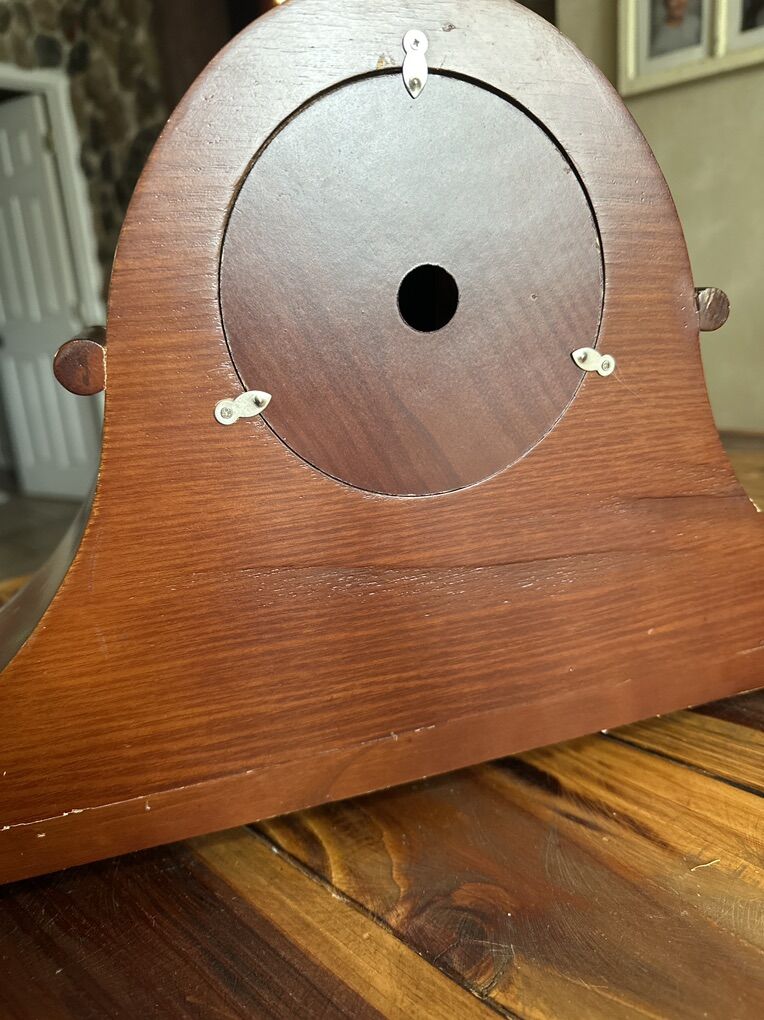 Wallace Silver Smith made the clock. Runs on two AA batteries and one AA battery will make the clock charm every hour. Couple scratches on the cherry walnut color.  overall is in nice condition. CASH ONLY!