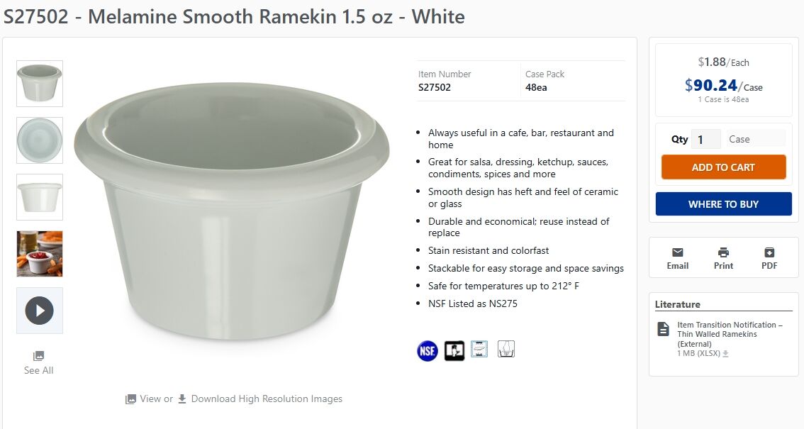 Always useful in a cafe, bar, restaurant and home. Great for salsa, dressing, ketchup, sauces, condiments, spices and more/ Smooth design has heft and feel of ceramic or glass. Durable and economical; reuse instead of replace. Stain resistant and colorfast. Stackable for easy storage and space savings. Safe for temperatures up to 212° F. NSF Listed as NS275